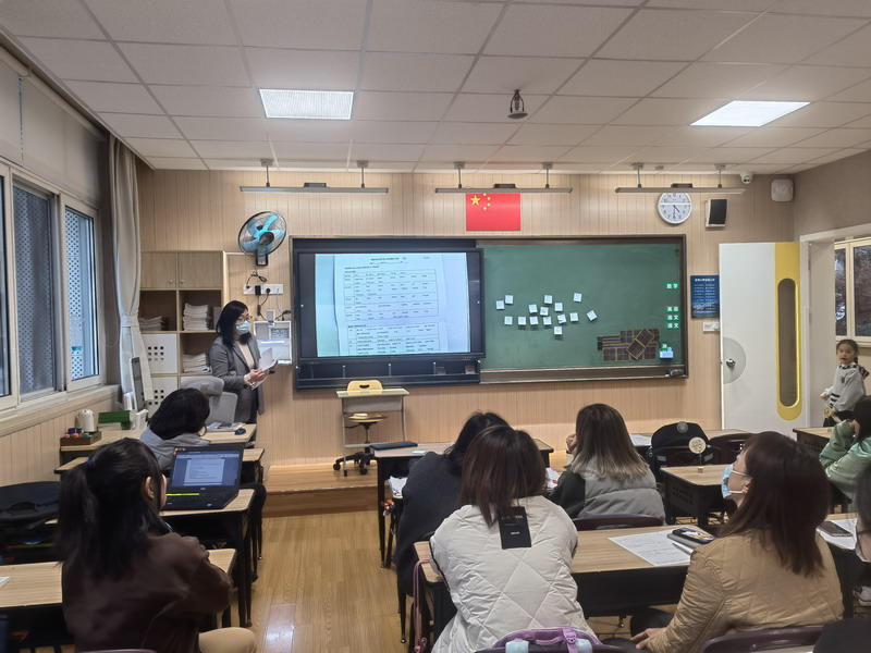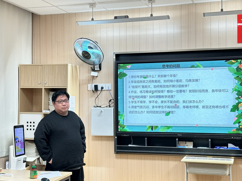 接著,姜軼黎老師進行了題為“務實篤行 行穩致遠”的發言,結合“綠標”測試的題目和數據,進行了客觀的分析,明確了雖然參與測試的是四年級的學生,但知識是連貫且螺旋上升的,需要每個年級老師的共同努力,牢牢把握“課標”要求,吃透教材,設計能達成預期目標的學習任務。她詳細講述了數學組促進學生的發展和成長的一些方法:夯實日常教學;培養學生學習習慣;實行因材施教;組織多元學習等。