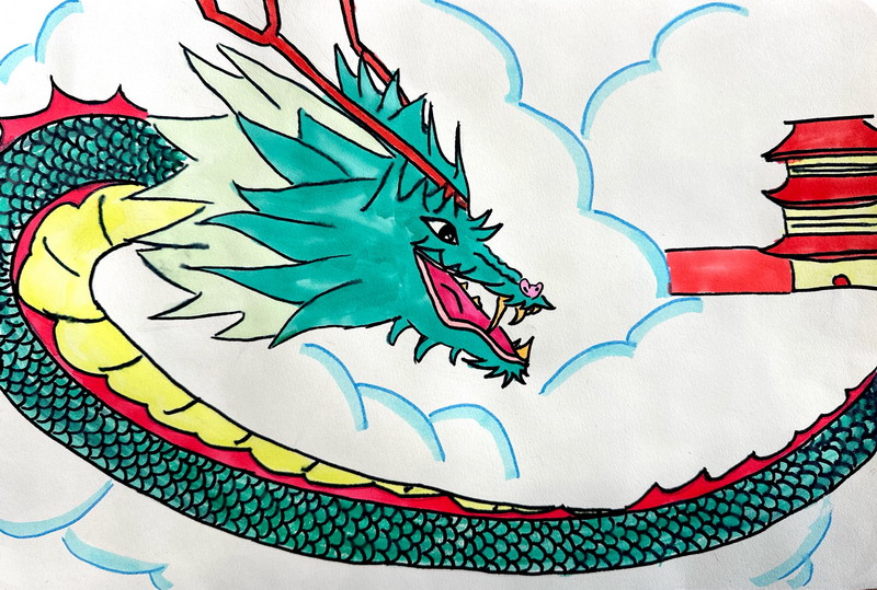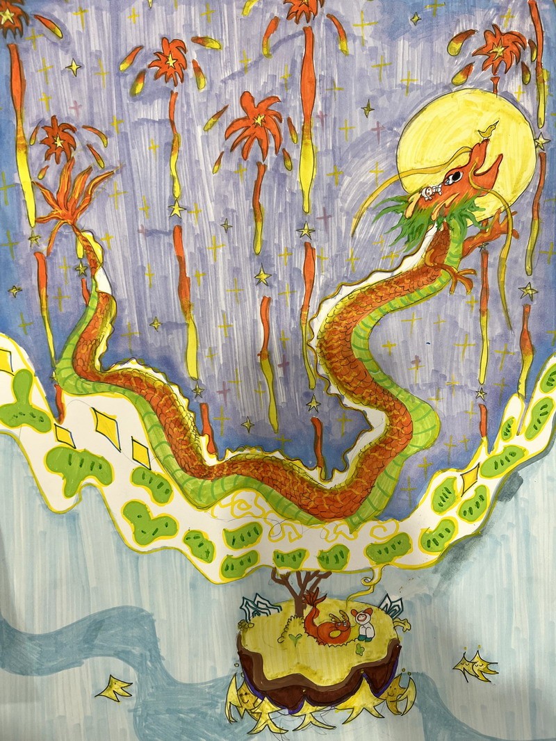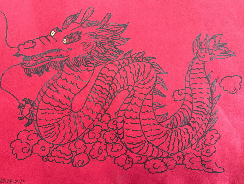 “迎新”當然少不了熱鬧的氣氛和熱烈的色彩。同學們畫筆下的龍色彩鮮艷,給人以強烈的視覺沖擊。