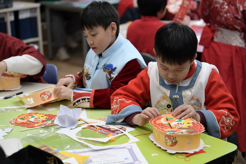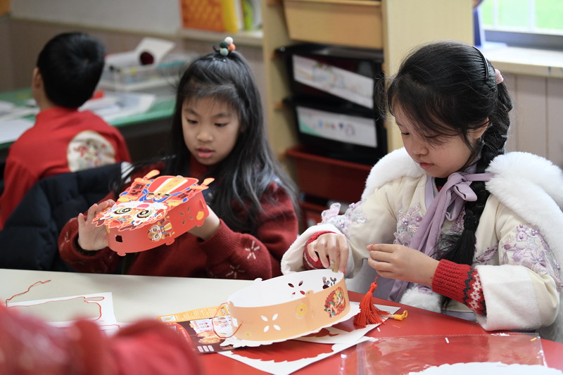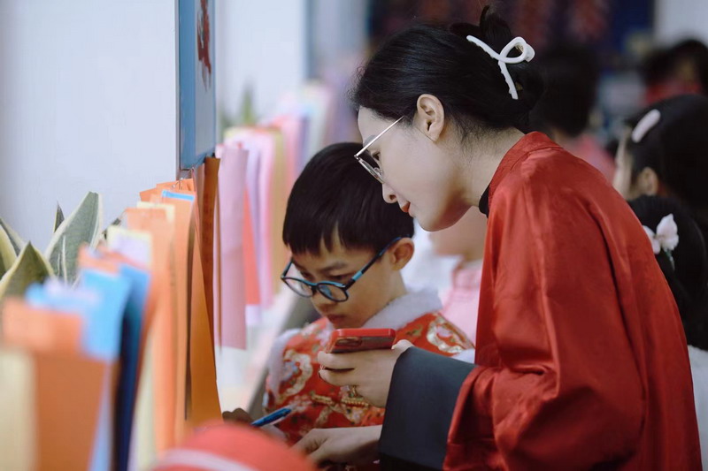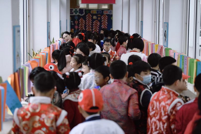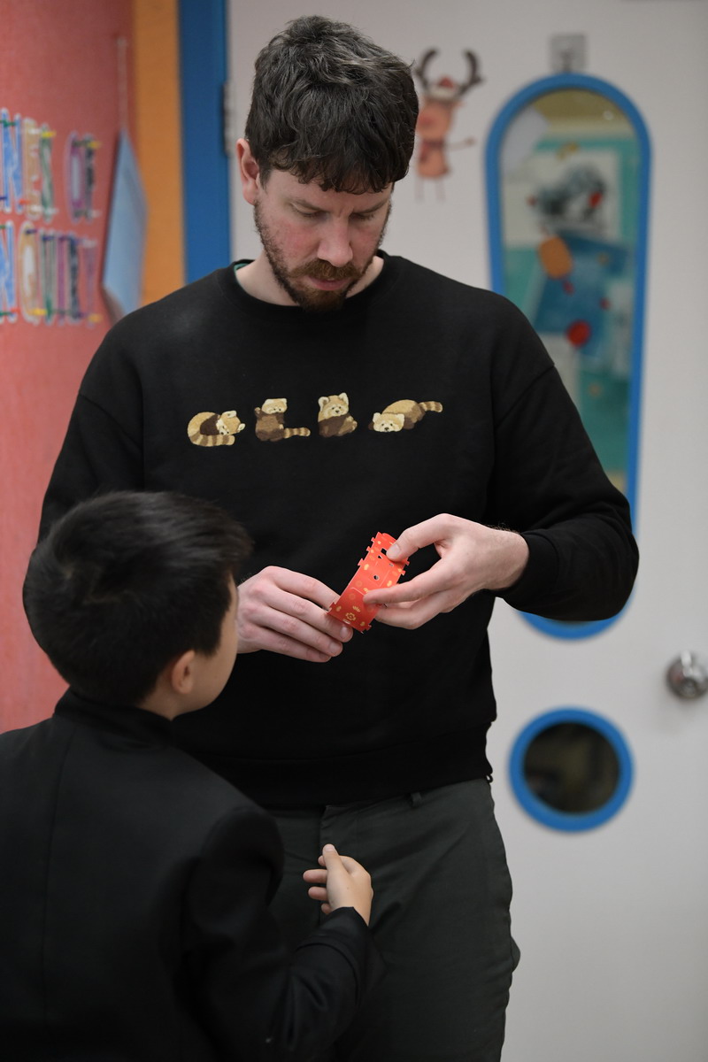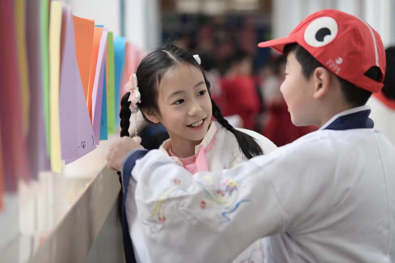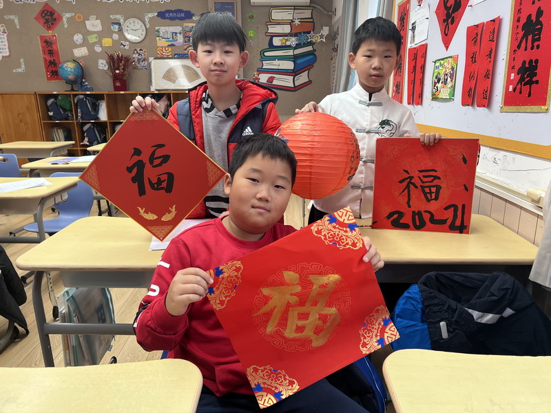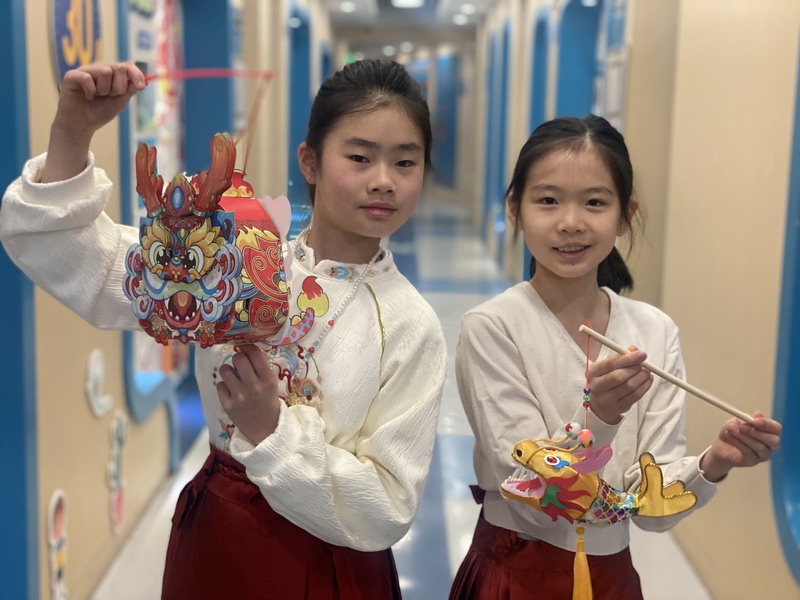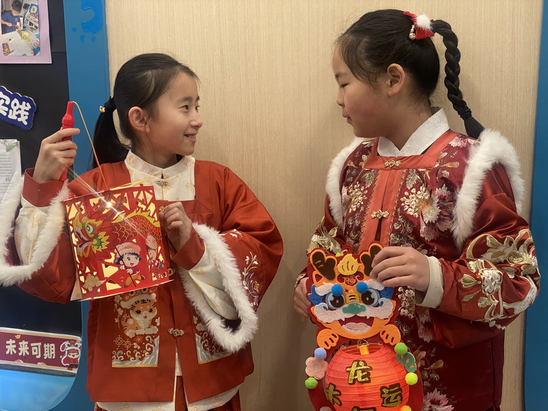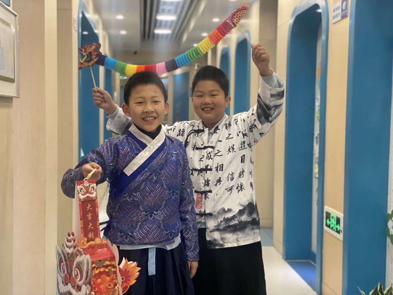 四年級的同學們則負責掛燈籠。寒假里,他們認真制作了形狀各異的燈籠。開學伊始,他們小心翼翼地將新年燈籠掛在校園里,讓校園變得更加溫馨和喜慶。來來往往的師生們駐足欣賞、討論,感受傳統燈籠的魅力。