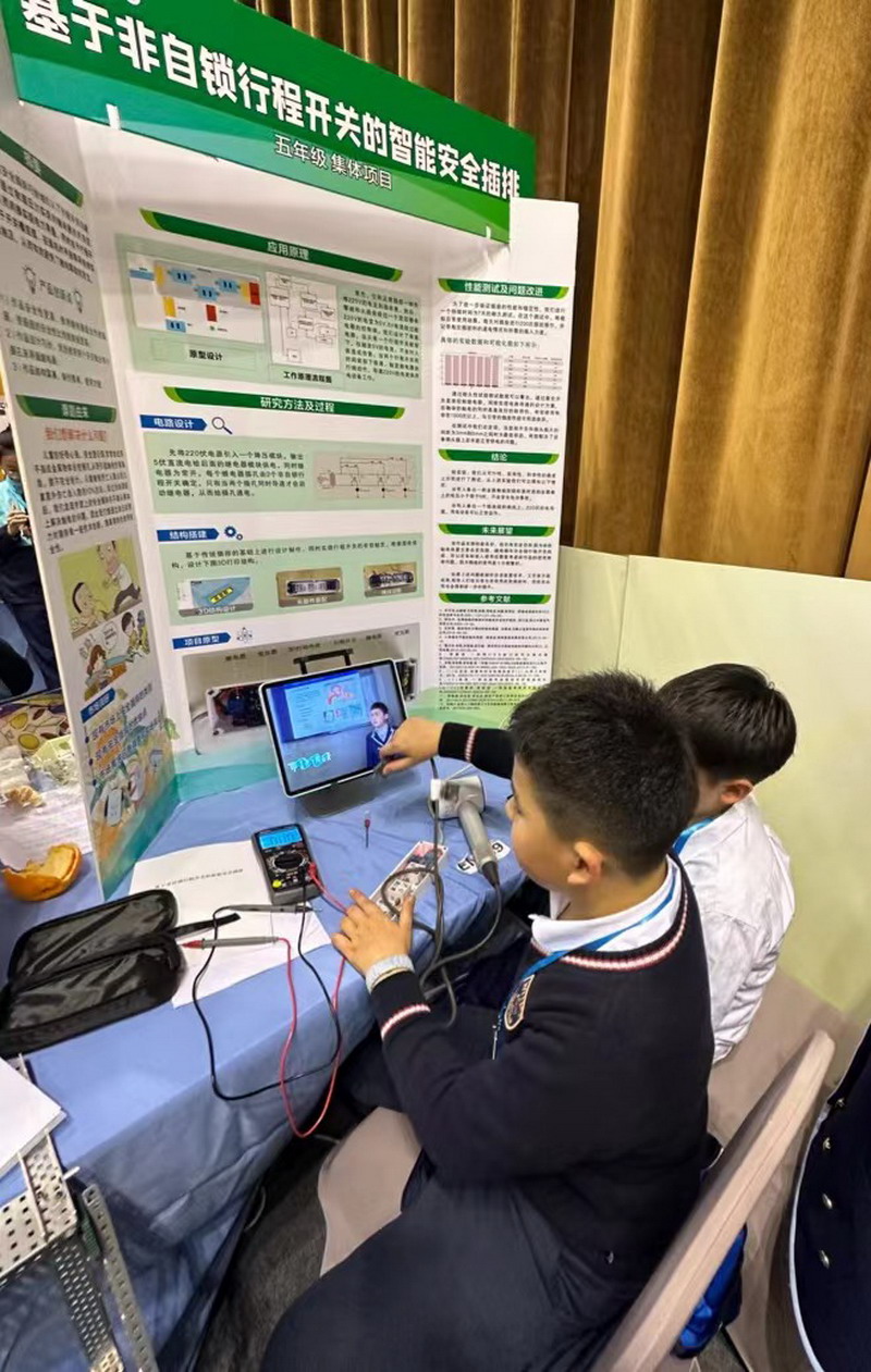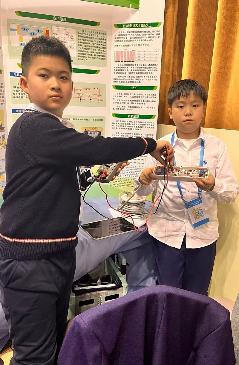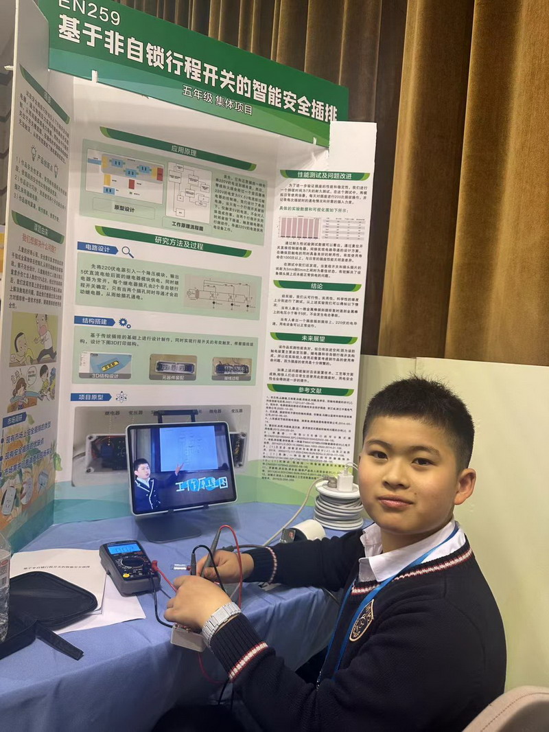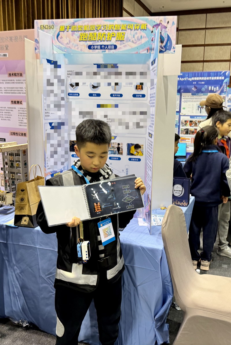 他們是黃楚喬和周梓翼,他們的作品是《基于非自鎖行程開關的智能安全插排》。四年級的徐睿,他的作品是《基于微型機器學習的智能可穿戴跑酷防護服》。