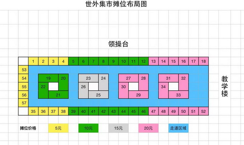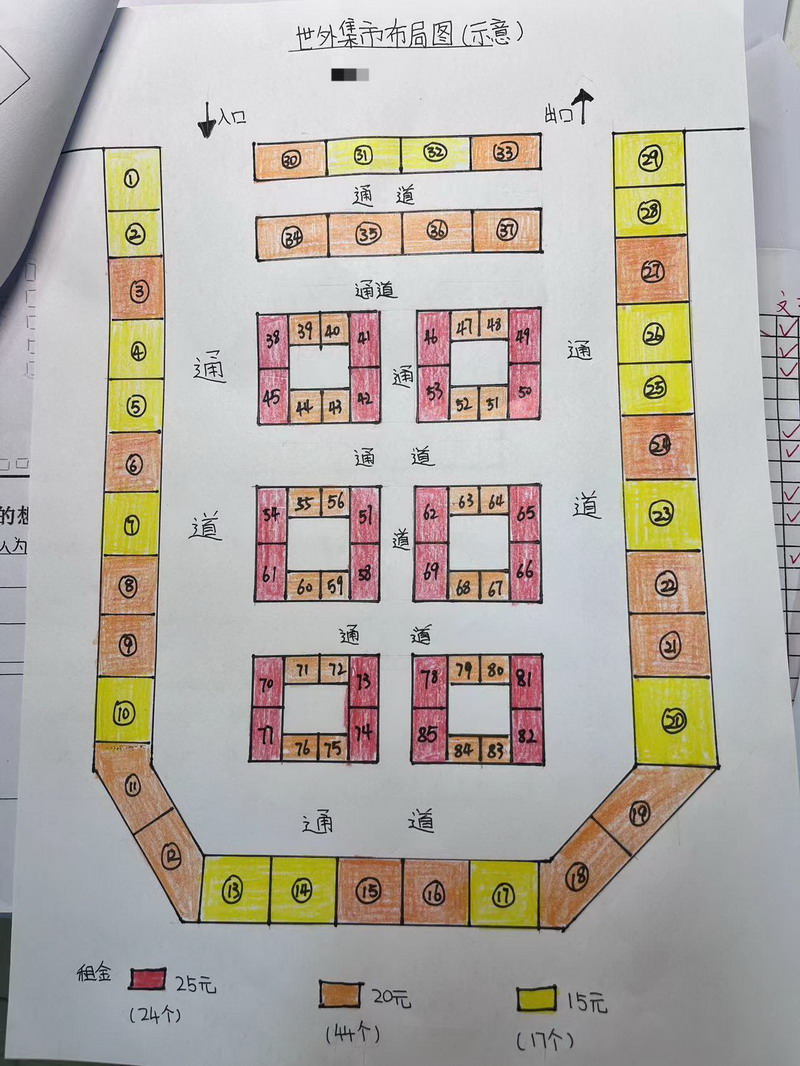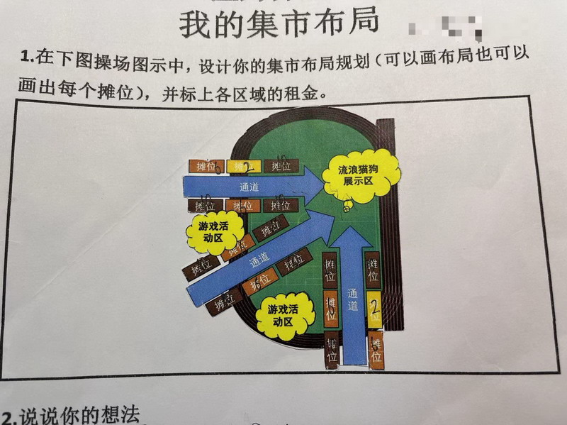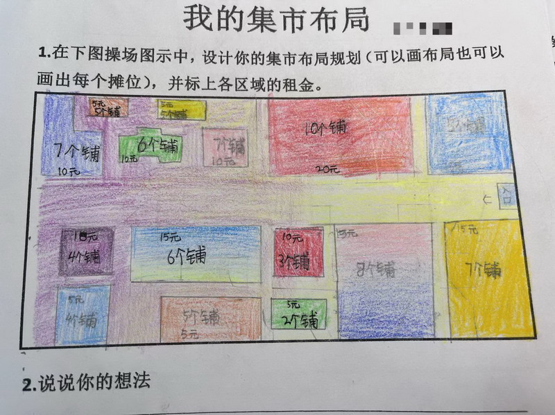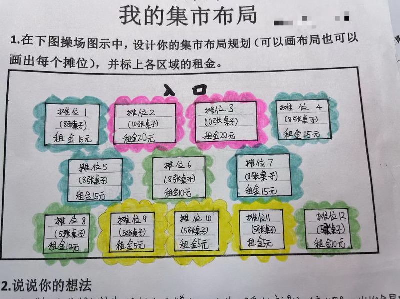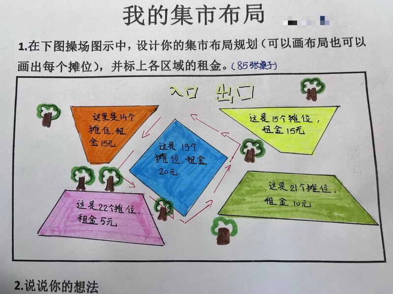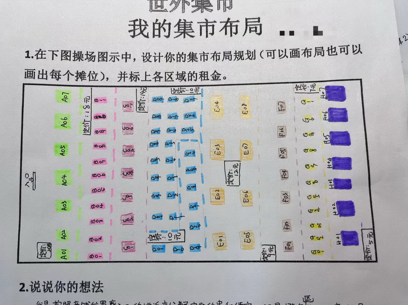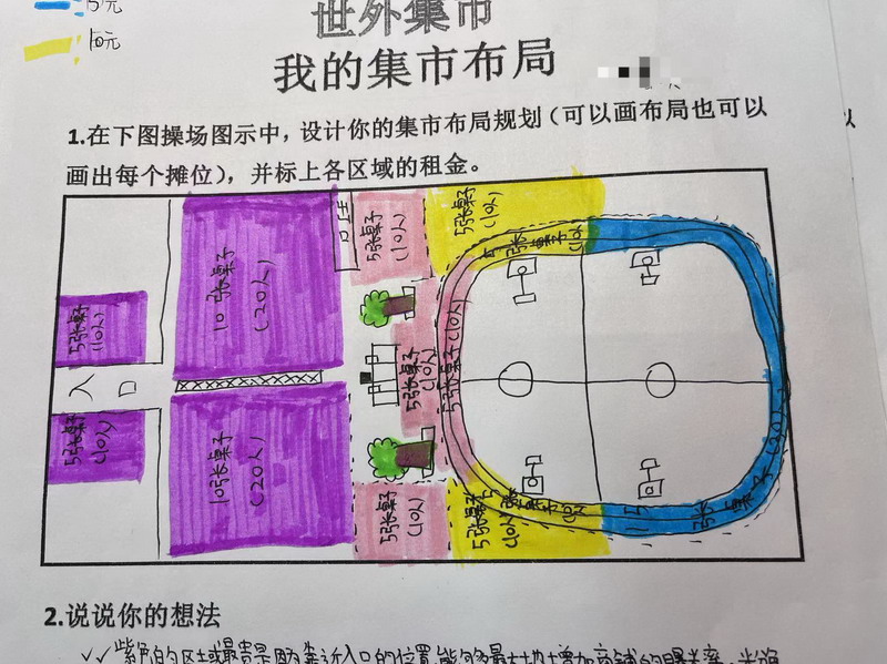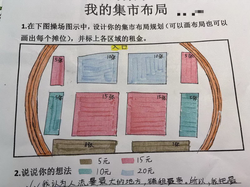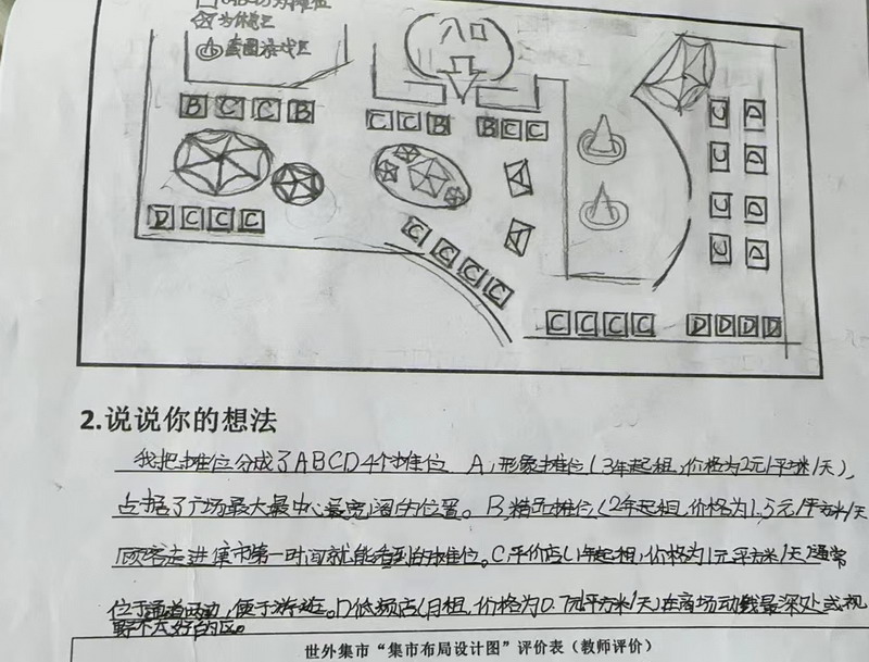 本次課程中,我們放手讓孩子自己設計集市布局圖。周末,學生實地去商場、社區集市等了解不同的集市布局及各種布局的優缺點。隨后,孩子們根據學校的場地進行設計。大家投票選出最優方案作為最終的集市布局方案。此設計者可以免掉攤位租金。