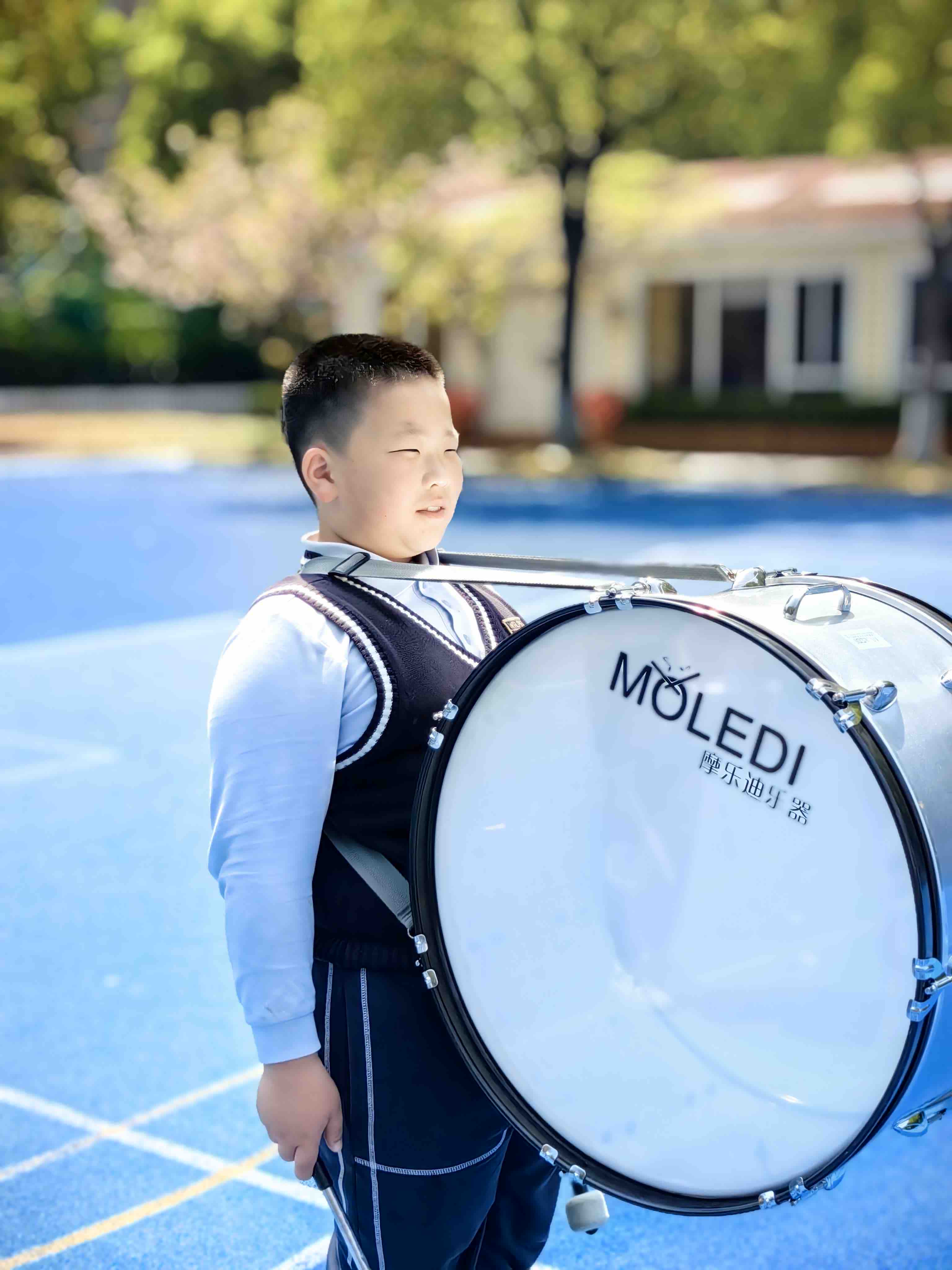 朱天樂:今年2月,我有幸加入了世外小學鼓號隊,成為一名大鼓鼓手。因為以前沒有打鼓的經驗,所以一開始我的心里是有些忐忑的,但是通過老師們耐心的教導,和平時辛苦的練習,我逐漸熟練掌握了鼓點節(jié)拍。寒風凜冽的清晨,手指因寒冷而麻木,我們沒有退縮;艷陽高照的中午,汗水如雨,浸濕了校服,我們沒有妥協(xié)。雖然每次訓練完,沉重的大鼓都壓得我肩膀酸疼,但是想到和隊友們一同訓練時經歷的酸甜苦辣,這些疼痛瞬間煙消云散。鼓號隊并不是一個人的獨奏曲,通過訓練,培養(yǎng)了我們全體隊員的團結協(xié)作能力,練就了我們不畏艱難、鍥而不舍的精神,希望下一屆鼓號隊我還能參加,為學校爭光!