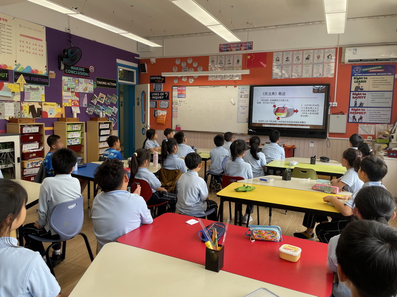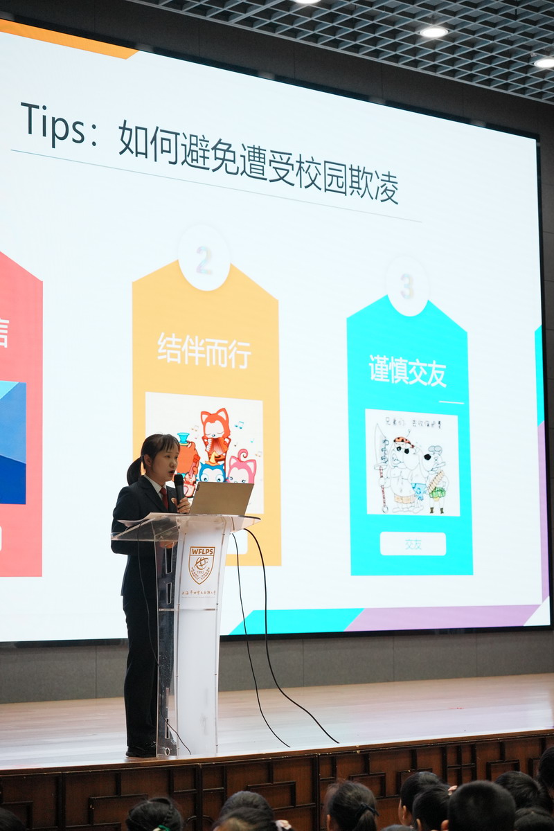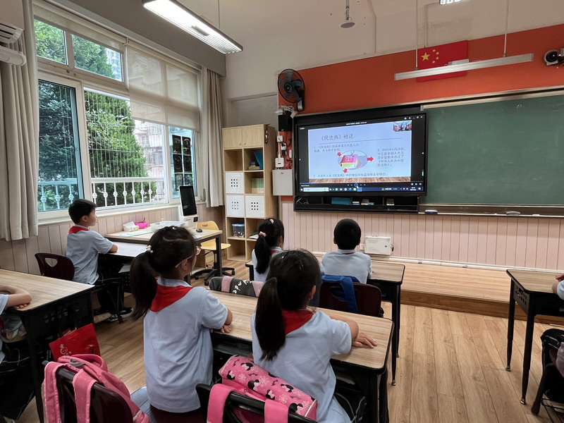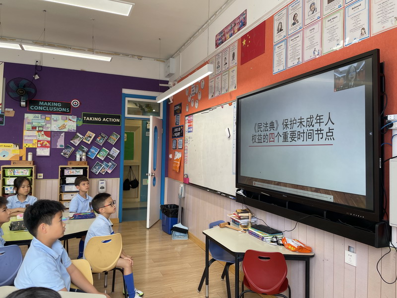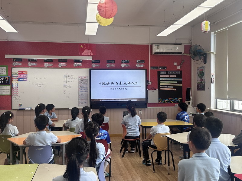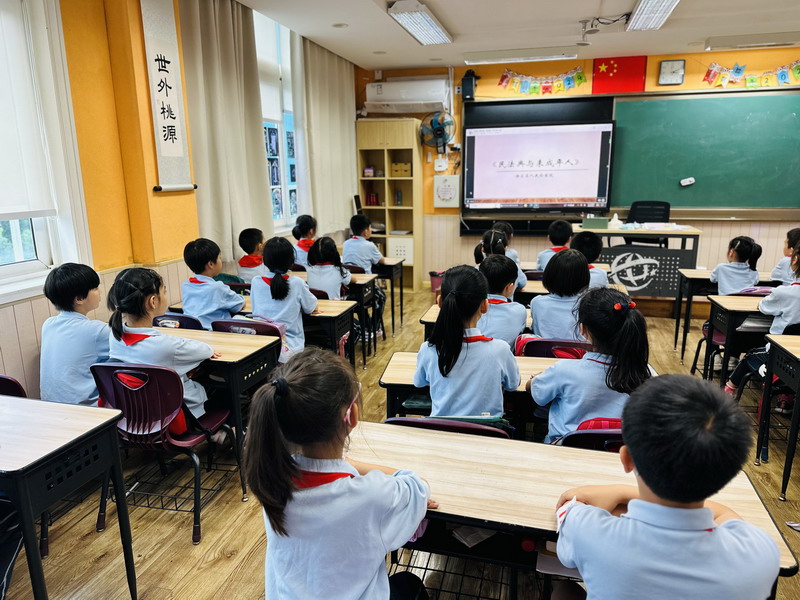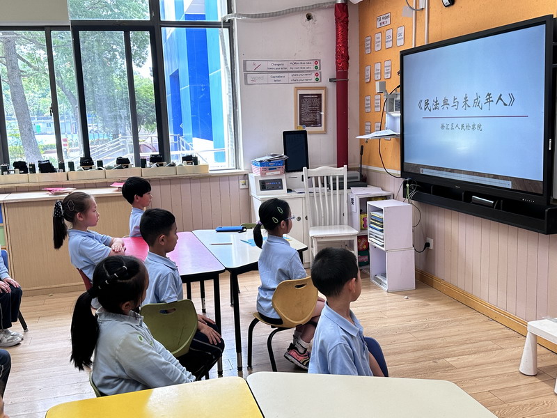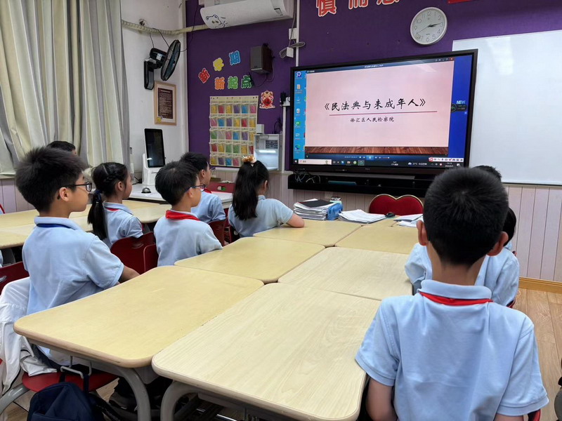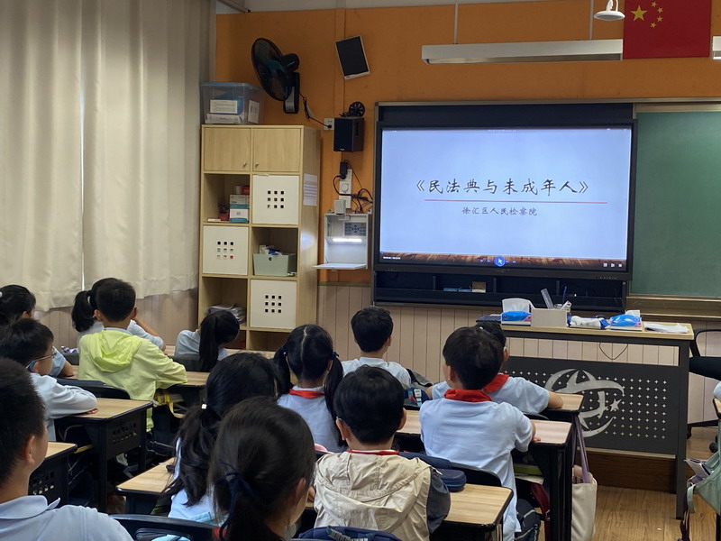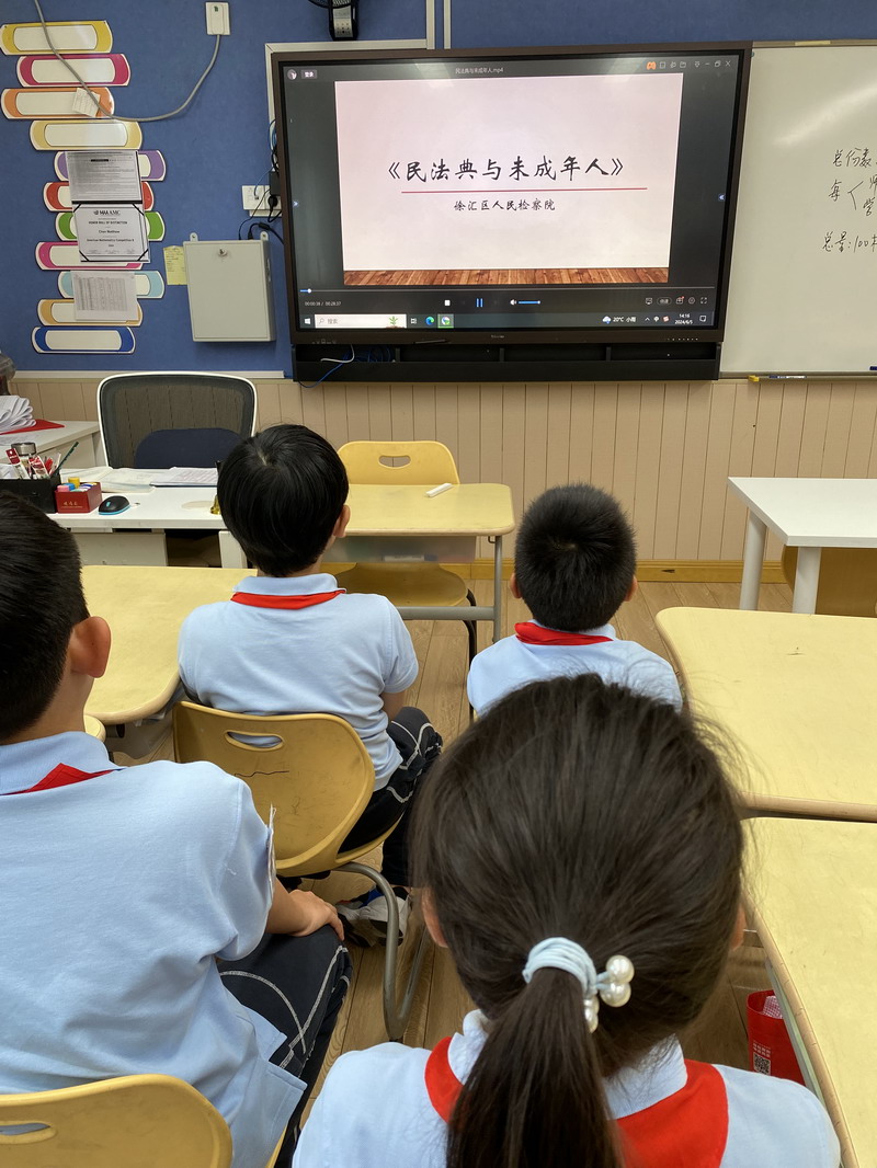 學校的法治副校長,來自徐匯區檢察院未檢辦案組負責人、第一檢察部馮品晶副主任為全體三至五年級師生開展講座。結合了當下熱點“預防校園欺凌”,深入淺出地向學生們介紹基礎法律知識以及民法典中有關預防未成年人犯罪的內容。學校的法治輔導員,來自康健街道派出所的林一凡警長也出席講座,對學生們發出“遵紀守則,做守法小公民”的呼吁。