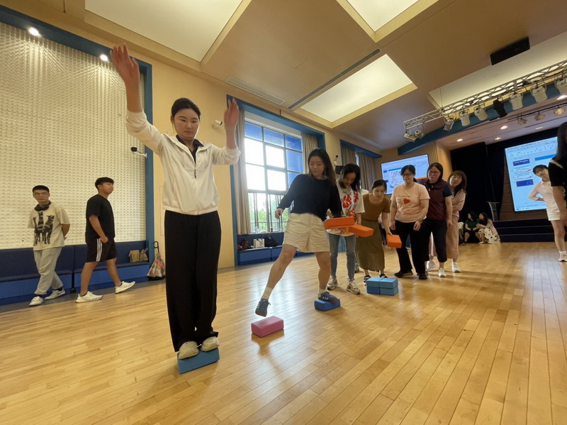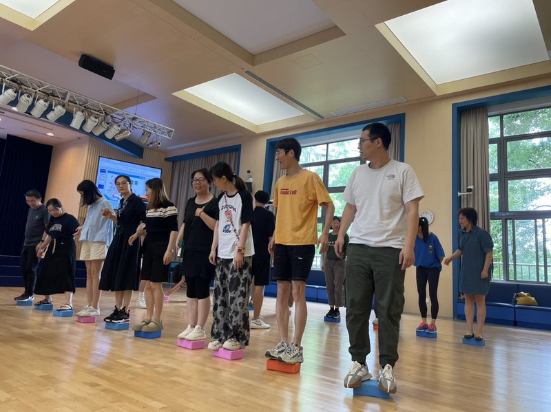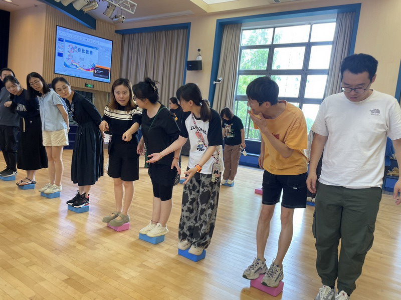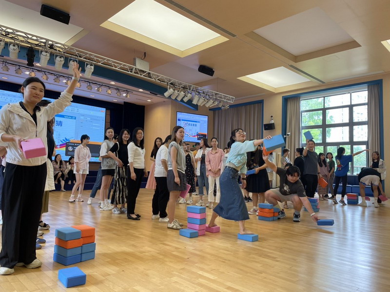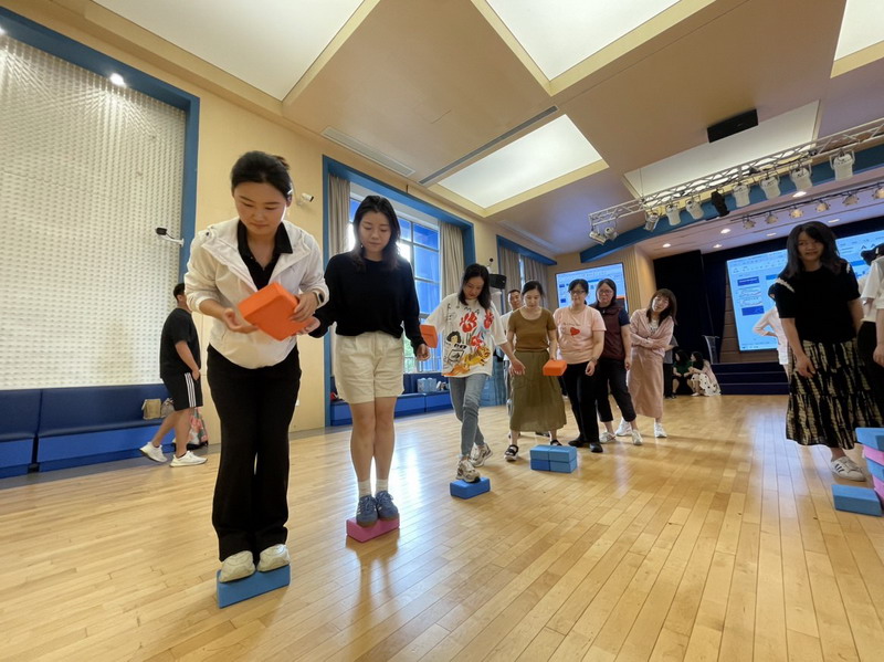 在學校體育館,首先進行的是有趣的“踏石過河”項目。這個項目要求每位老師踩在一塊磚塊上,依次前進,通過團隊協作,共同抵達終點。
