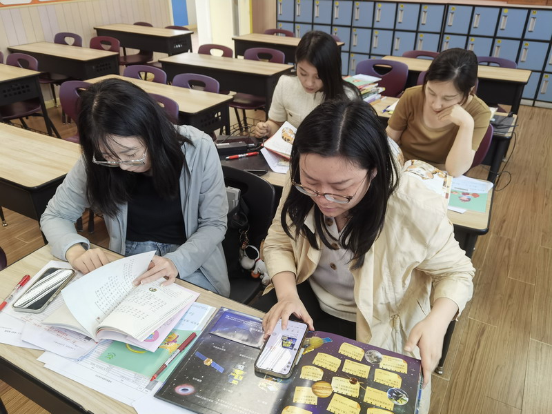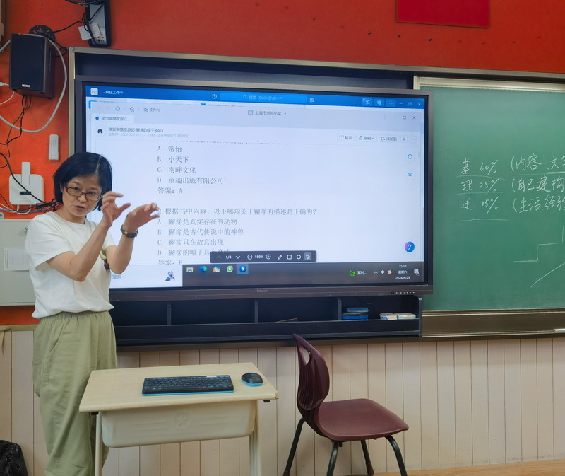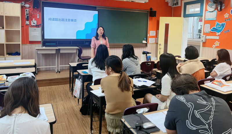 另一方面,我校也一直在語文課程中極力推進閱讀課程,希望孩子們能夠養成良好的閱讀習慣,受益終身。除創設優良的閱讀環境,開展有趣的閱讀活動之外,我校還重點推出了“Reading first”悅讀計劃,變“閱讀”為“悅讀”。為了更好地促進學生的閱讀,有效檢測學生的閱讀水平,我們在中文閱讀方面,引進了“一閱讀”平臺,通過字數累積、“水晶”獎勵等方式,不斷激勵學生多多閱讀。在這個平臺,學生們可以隨時更新自己的閱讀量,通過閱讀測試來檢測讀一本書的效果,但是隨著教育的發展,學生的視野日益開闊,知識面也越來越有寬度、廣度和深度,平臺上的書籍和題庫顯然已滿足不了我們學生的閱讀需求。于是,另一部分語文老師在陸校長的帶領下,在三天的培訓時間里,如火如荼地開展閱讀題庫研究。她們根據新調整的閱讀書單,沉浸閱讀書目,逐一匯報交流自己的思考,補充或修改平臺中的閱讀題庫,增加理解題和遷移題,以便未來能更加真實有效地幫助學生進行閱讀評估。