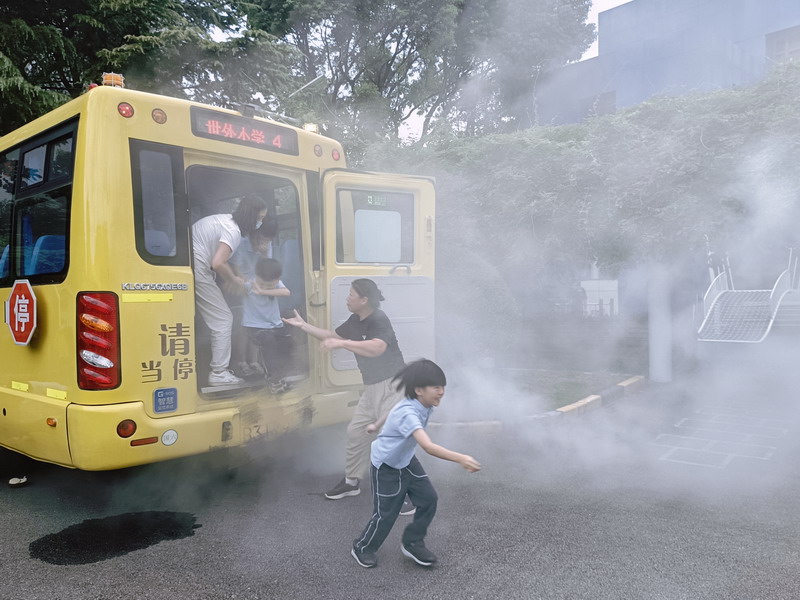9月12日下午三點,世外小學4號校車突發濃煙,警報聲隨即響起。司機師傅迅速作出反應,立即切斷電源并開啟車門。在教師的引導下,學生們有序地通過車門和緊急出口撤離。他們用濕毛巾遮住口鼻,保持彎腰姿勢,迅速而鎮定地向安全區域移動。