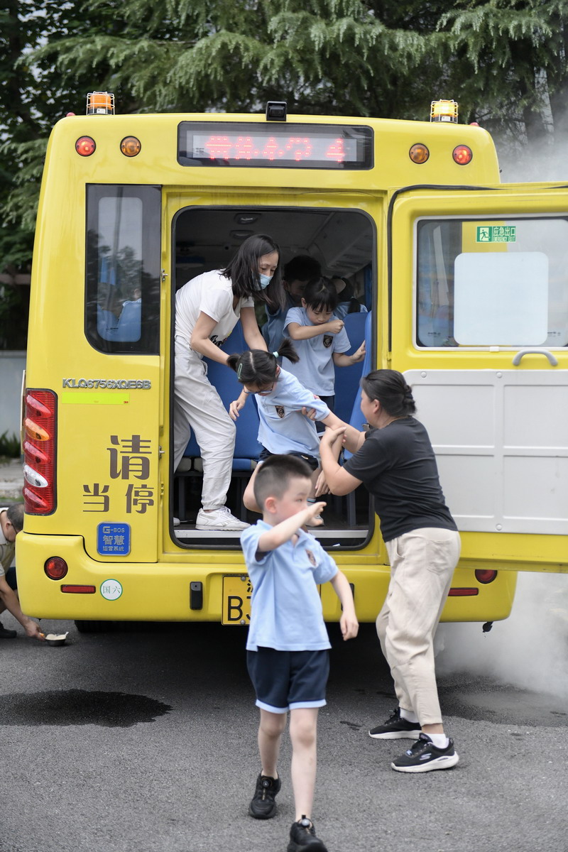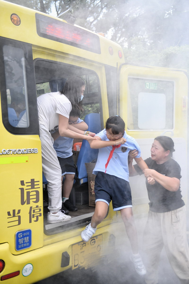 事實上,這是一次精心策劃的校車消防演練。學生們依次從煙霧彌漫的車廂中“逃生”,盡管氣氛緊張,但無人表現出慌亂。在教師的協助下,學生們迅速抵達安全地點,并進行了人數核對。