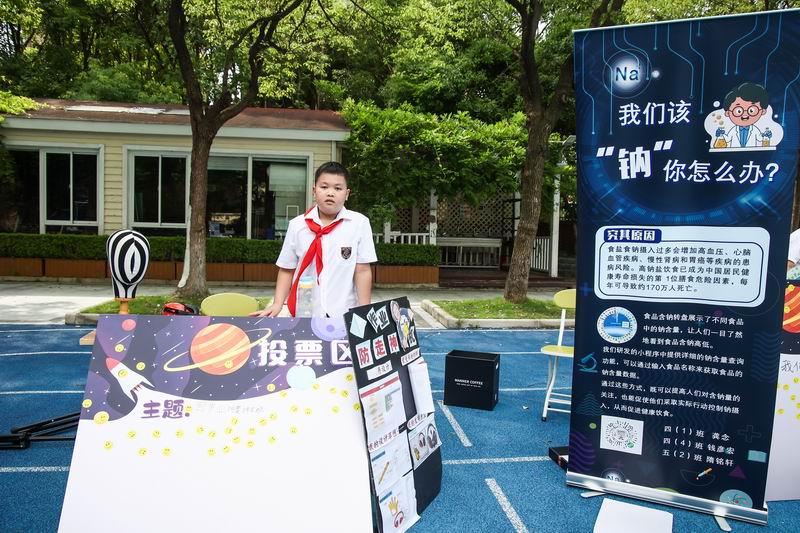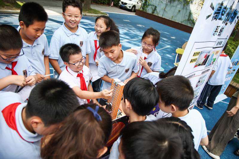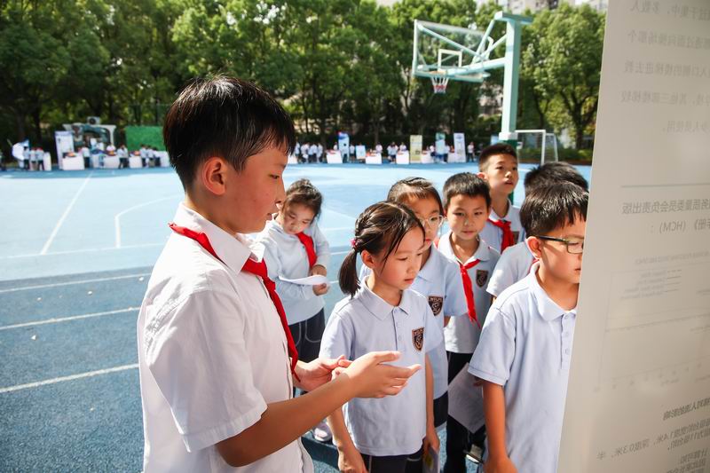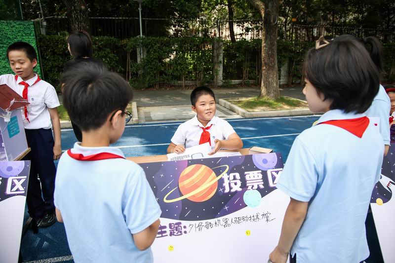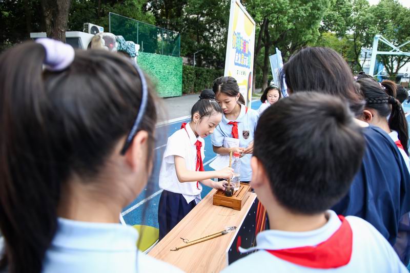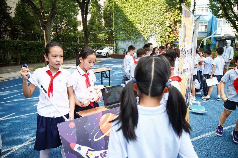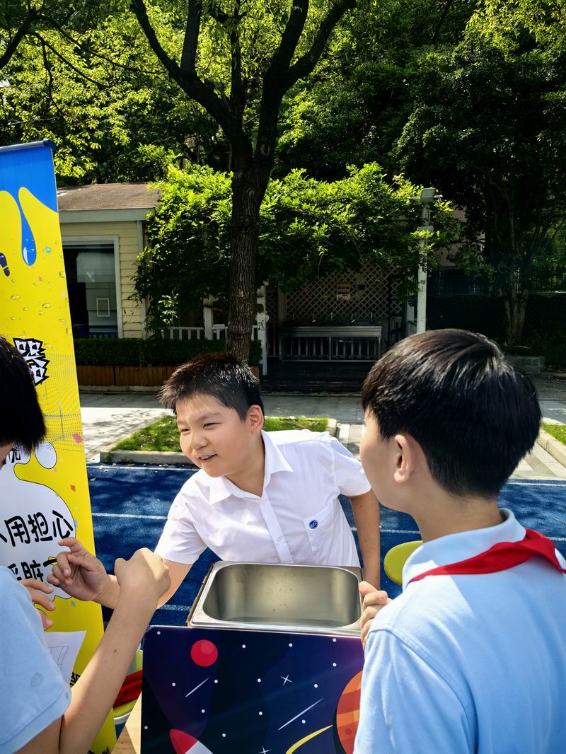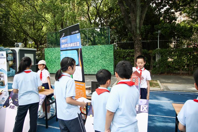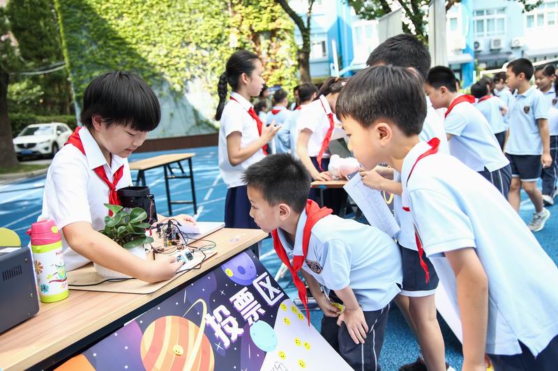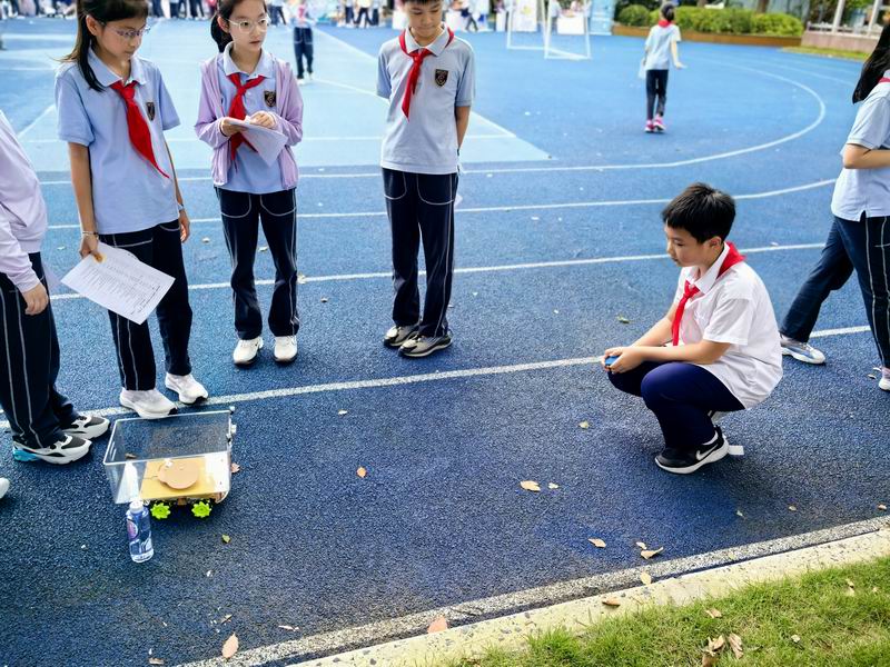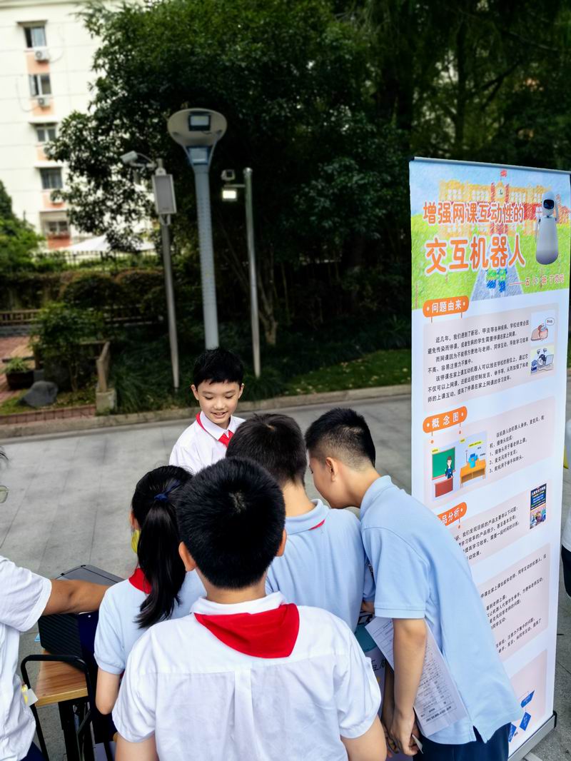 下午的校園展示熱鬧非凡,三、四、五年級的同學(xué)們來到每個展臺前,認真聆聽選手的講解,興致勃勃地參與互動演示。