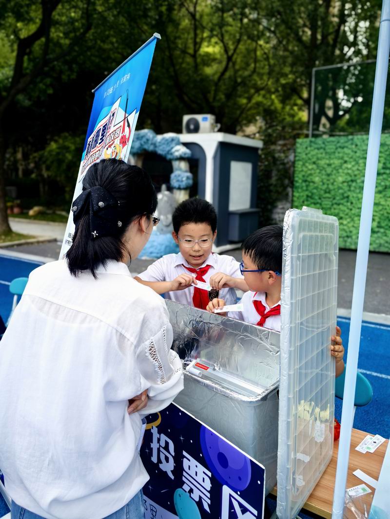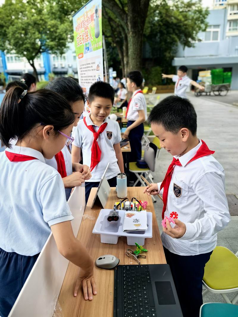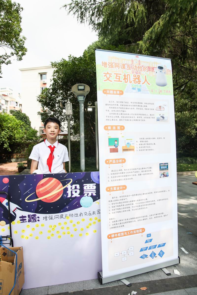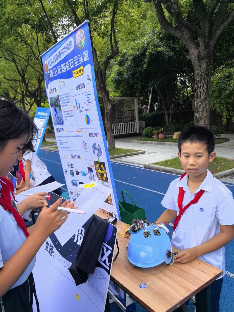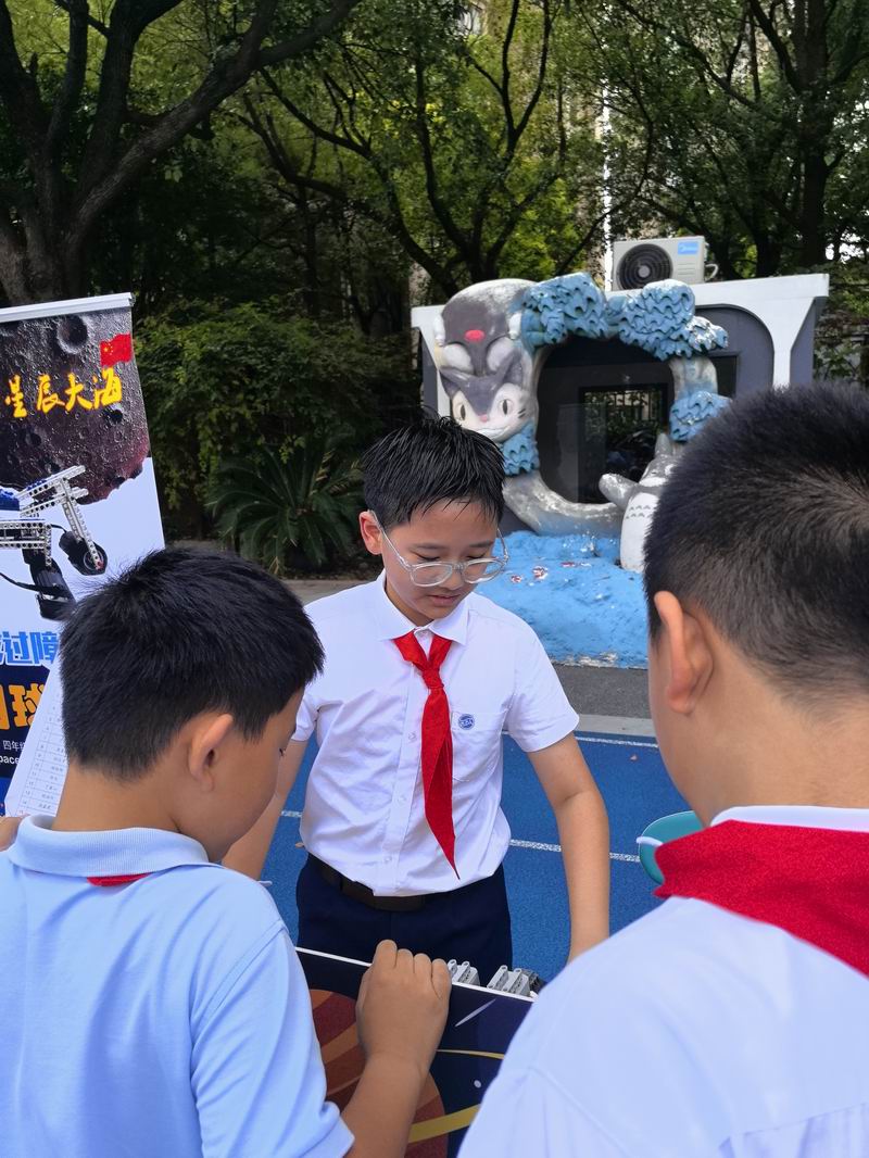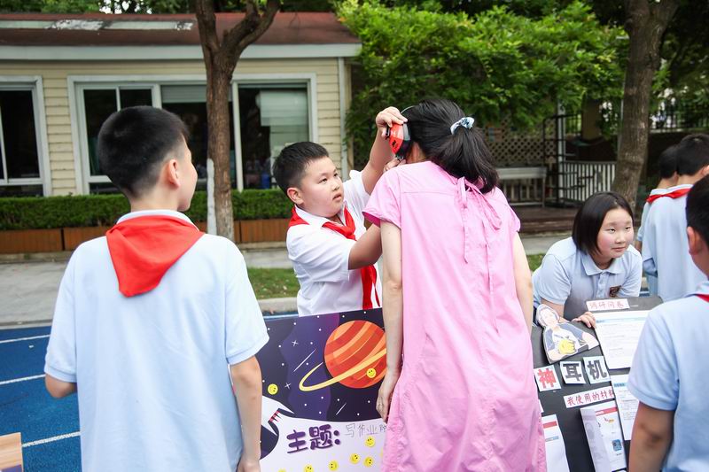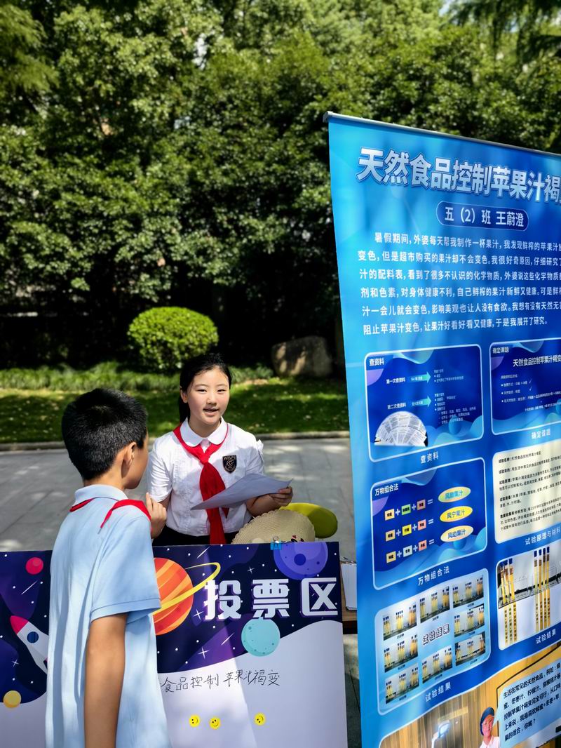 下午的校園展示熱鬧非凡,三、四、五年級的同學(xué)們來到每個展臺前,認真聆聽選手的講解,興致勃勃地參與互動演示。