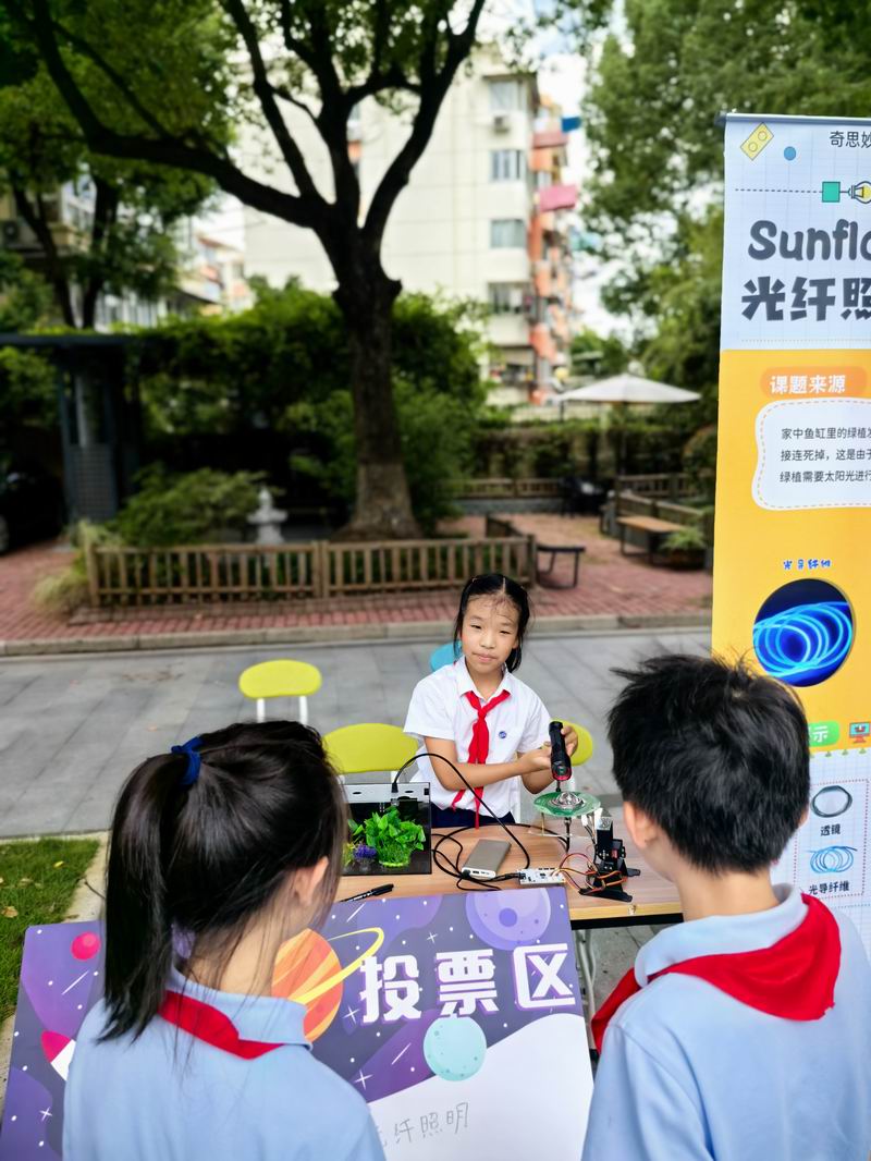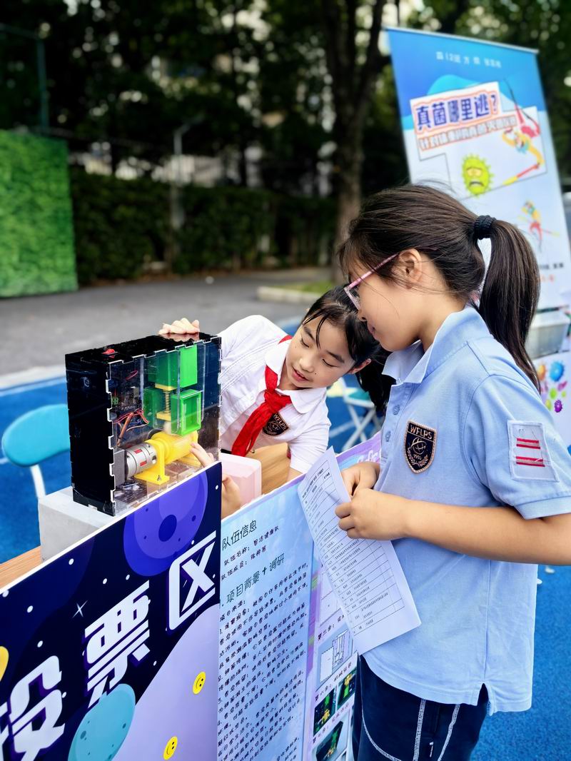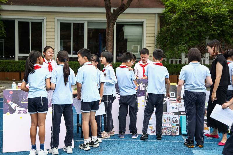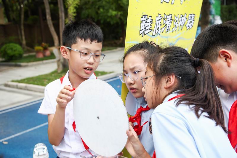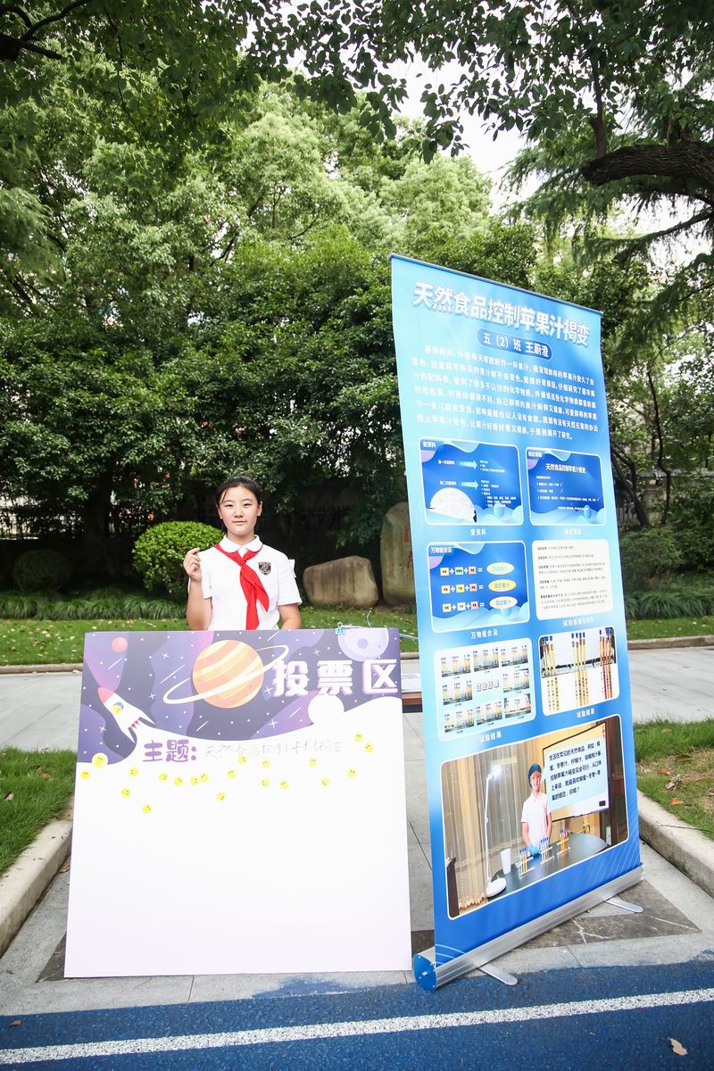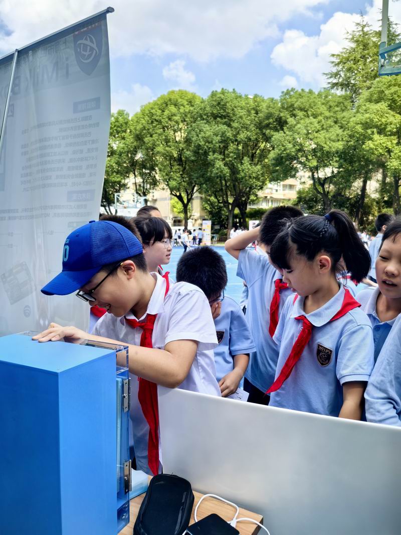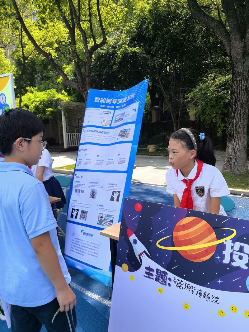 下午的校園展示熱鬧非凡,三、四、五年級的同學(xué)們來到每個展臺前,認真聆聽選手的講解,興致勃勃地參與互動演示。