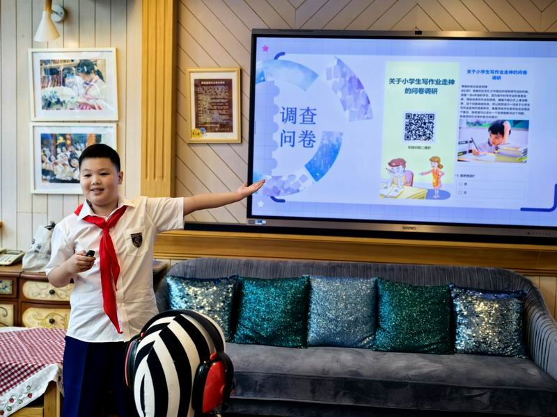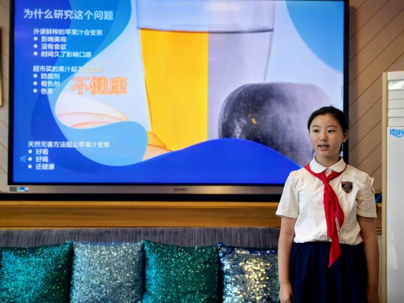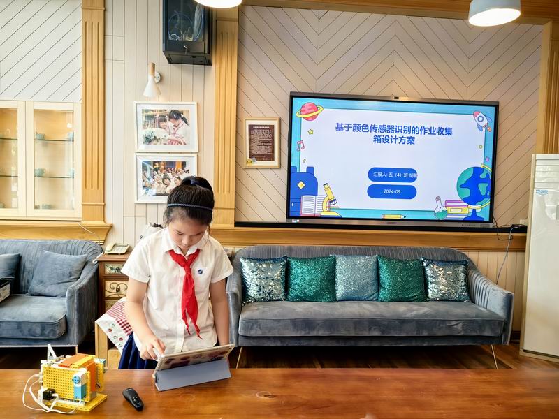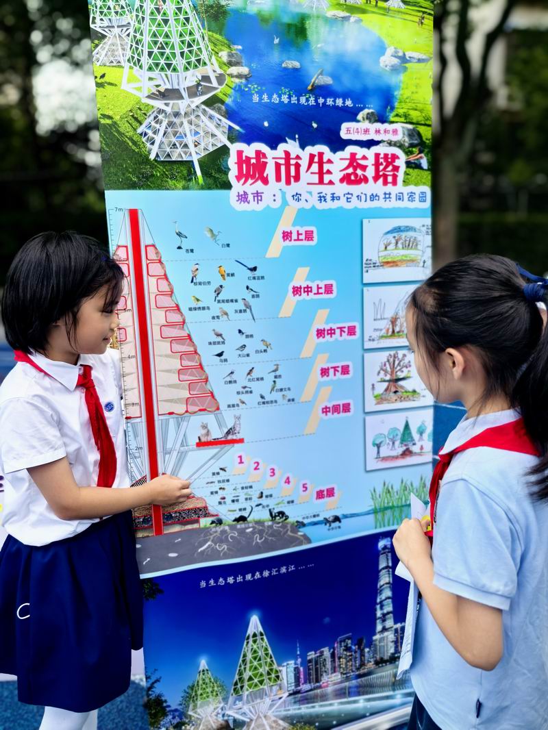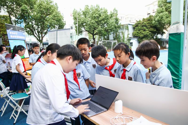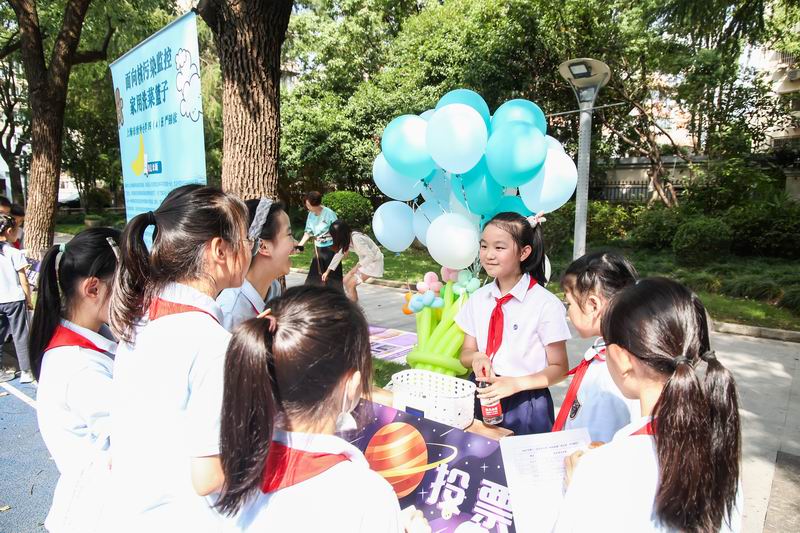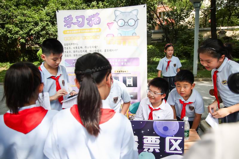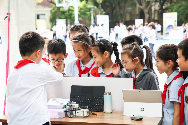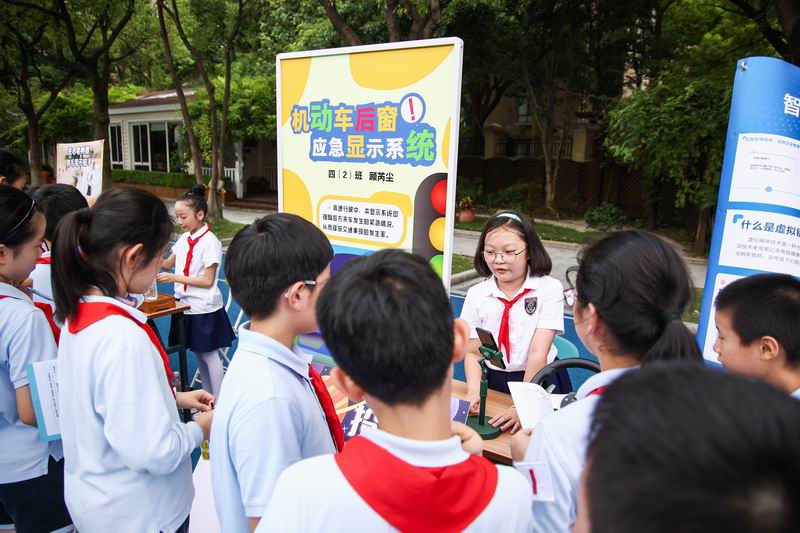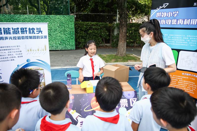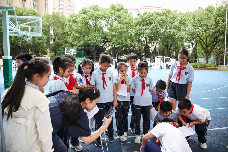 下午的校園展示熱鬧非凡,三、四、五年級的同學(xué)們來到每個展臺前,認真聆聽選手的講解,興致勃勃地參與互動演示。