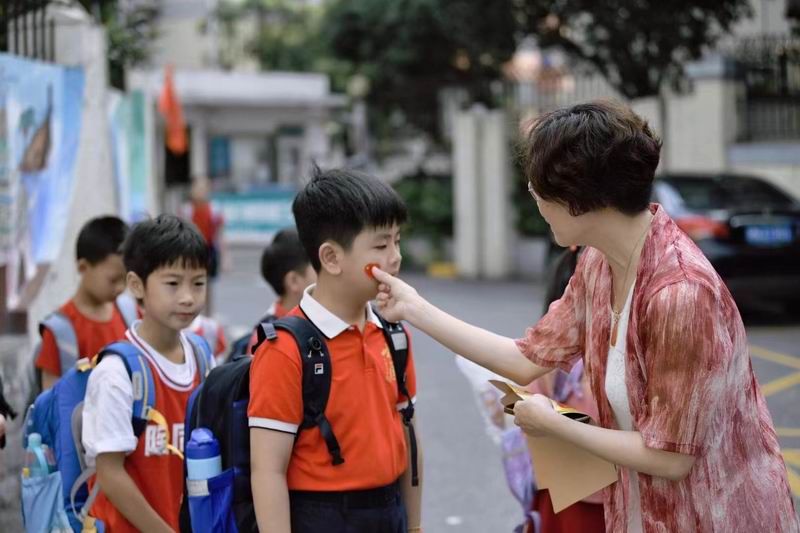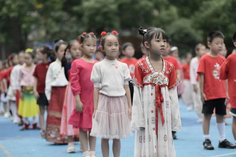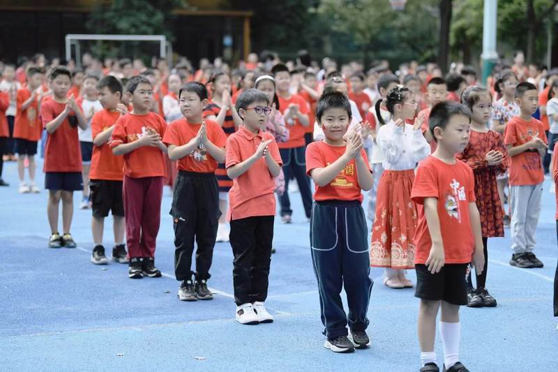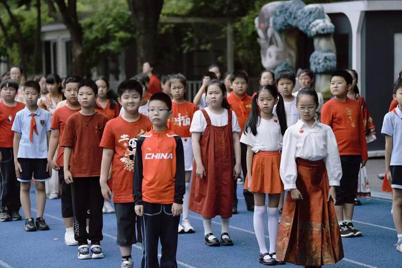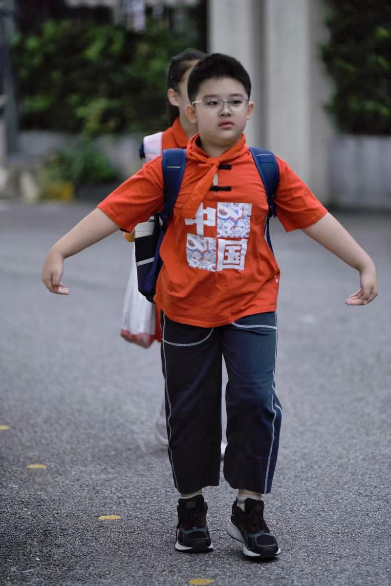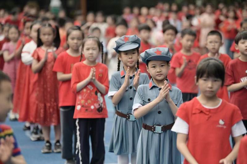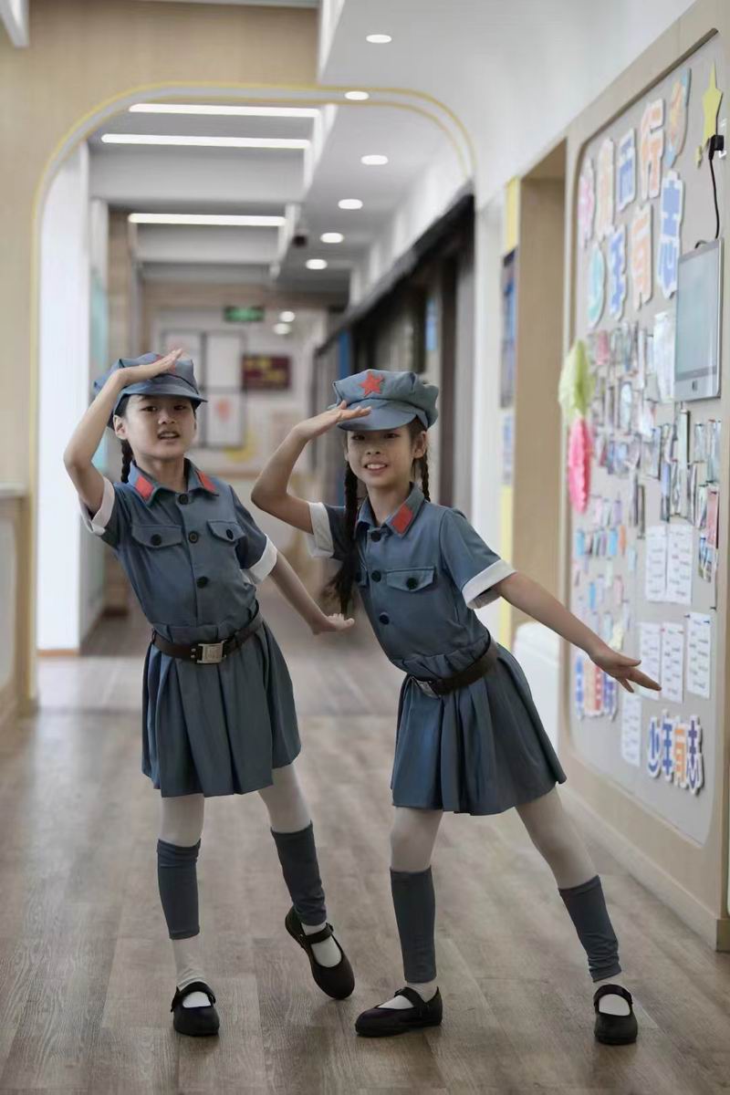 走進校園,首先映入眼簾的是一片紅色的海洋。有的孩子穿著傳統的中式服裝,小小的身軀在寬大的漢服中顯得格外可愛,仿佛穿越時空的小使者,傳遞著中華文化的深厚底蘊;有的則換上了充滿愛國情懷的服裝,胸前的五星紅旗圖案格外醒目,彰顯著孩子們對祖國的無限熱愛;更有不少孩子身著紅軍服裝,戴著八角帽,小臉上寫滿了對革命先輩的敬仰與緬懷。這些服裝不僅讓孩子們在視覺上享受了一場盛宴,更在心中種下了愛國主義的種子。