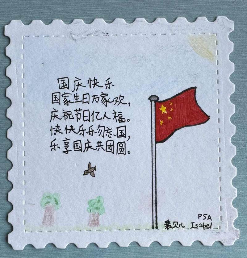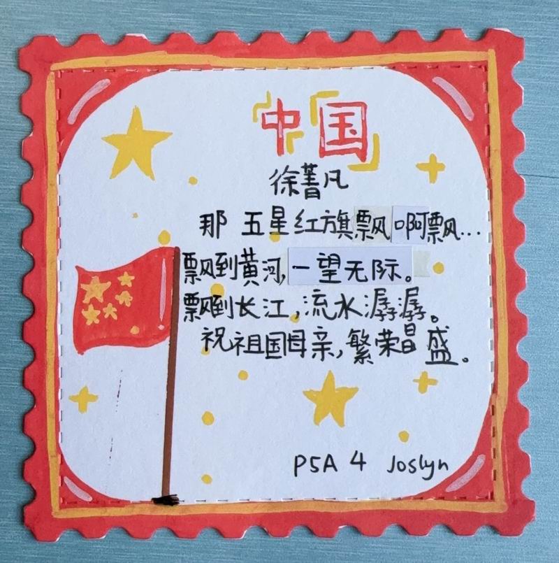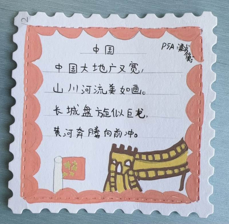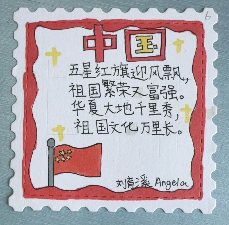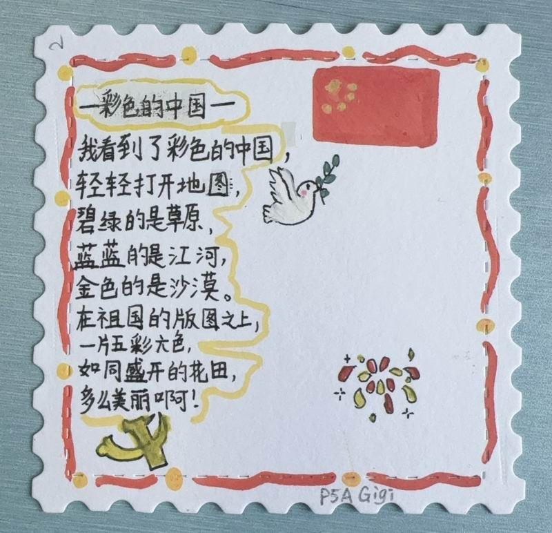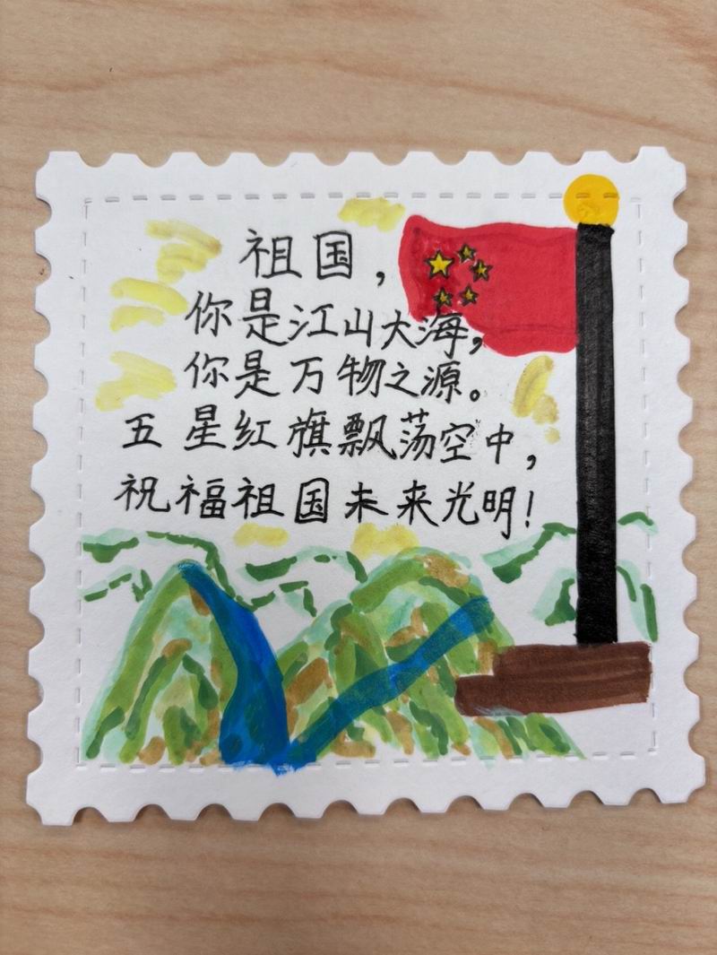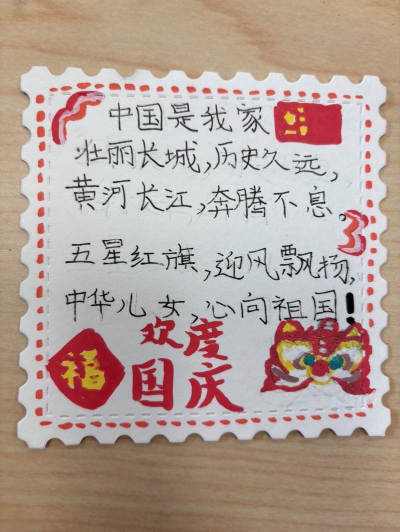 集會后的班級活動以互動體驗為主,學生參與了愛心手環制作和郵票設計的分享。在手工活動中,孩子們親手制作的手環,象征著對祖國的熱愛與團結。每個學生還設計了一張與中國相關的郵票,郵票內容涵蓋了動物、傳統節日、名勝古跡、科技成就等主題。