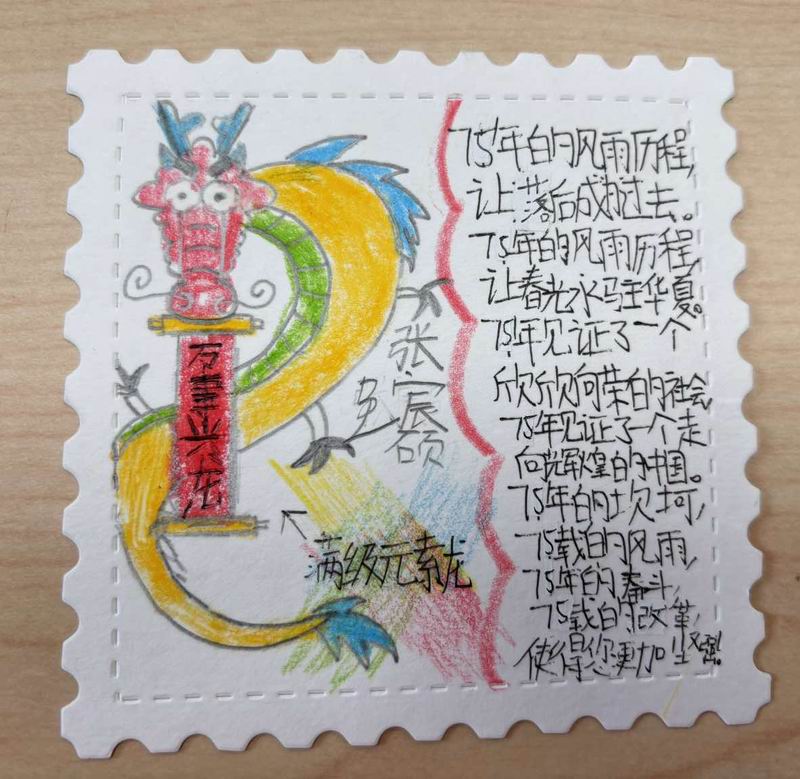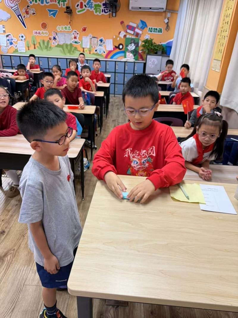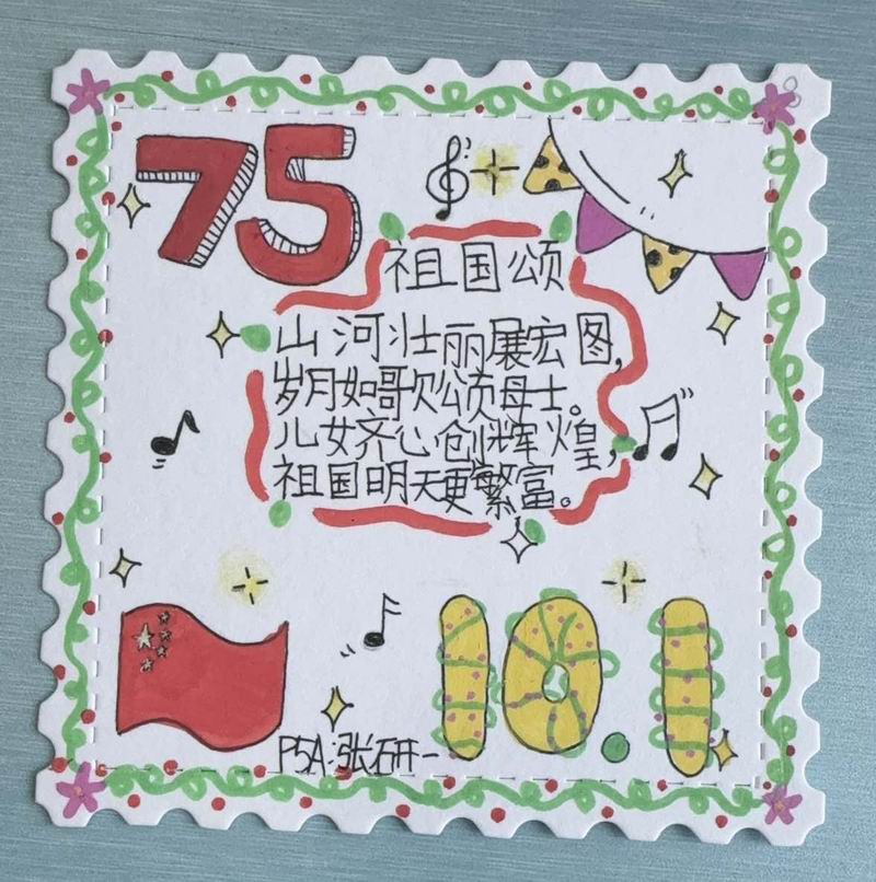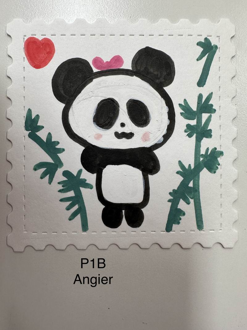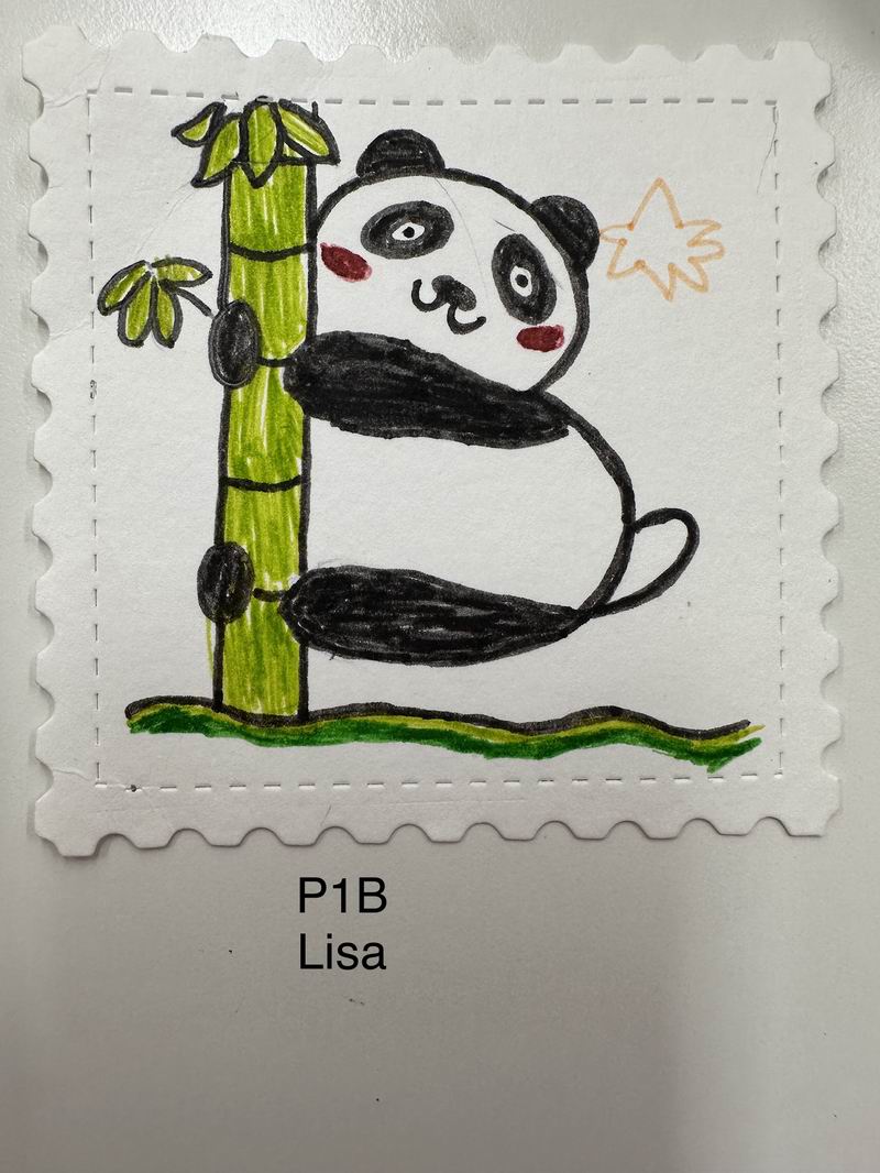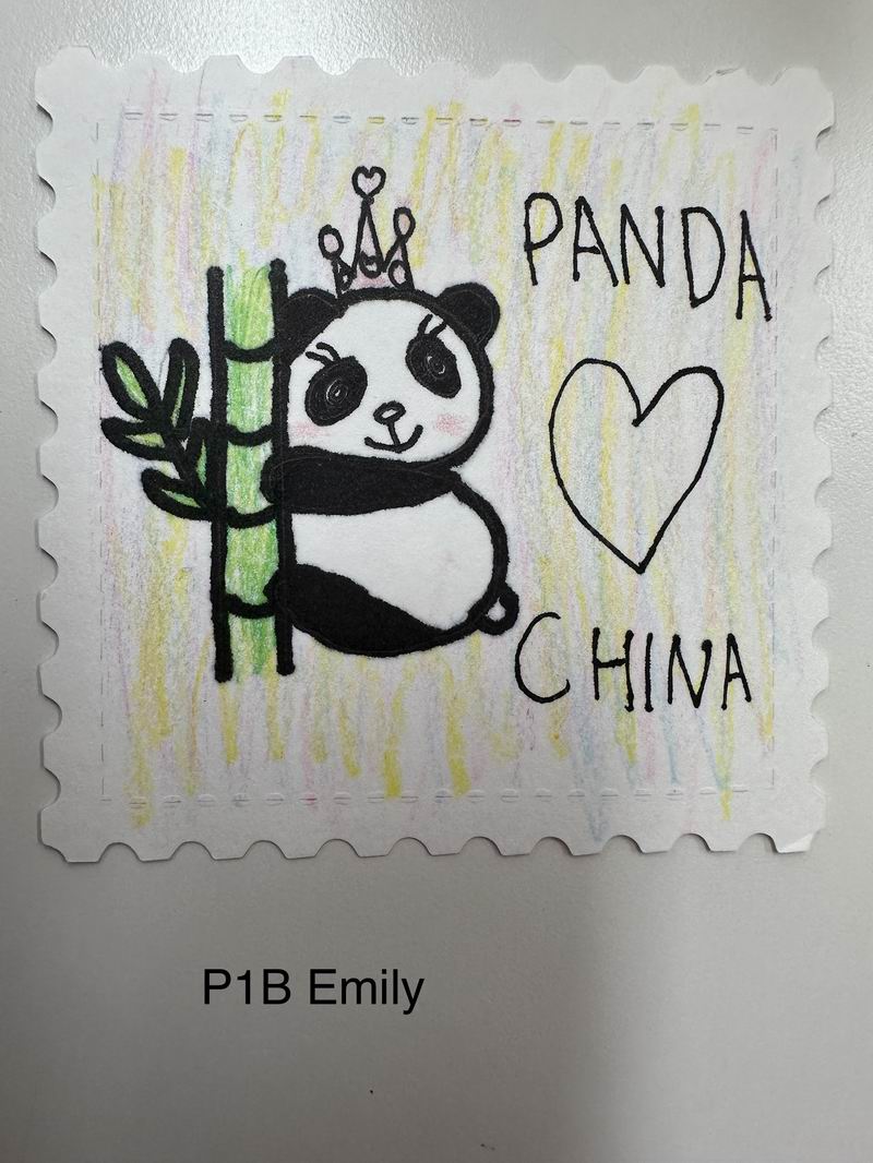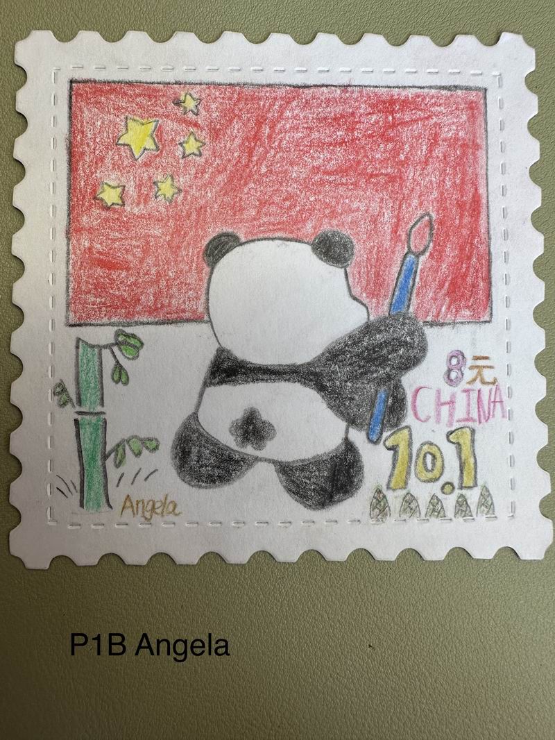 集會后的班級活動以互動體驗為主,學生參與了愛心手環制作和郵票設計的分享。在手工活動中,孩子們親手制作的手環,象征著對祖國的熱愛與團結。每個學生還設計了一張與中國相關的郵票,郵票內容涵蓋了動物、傳統節日、名勝古跡、科技成就等主題。