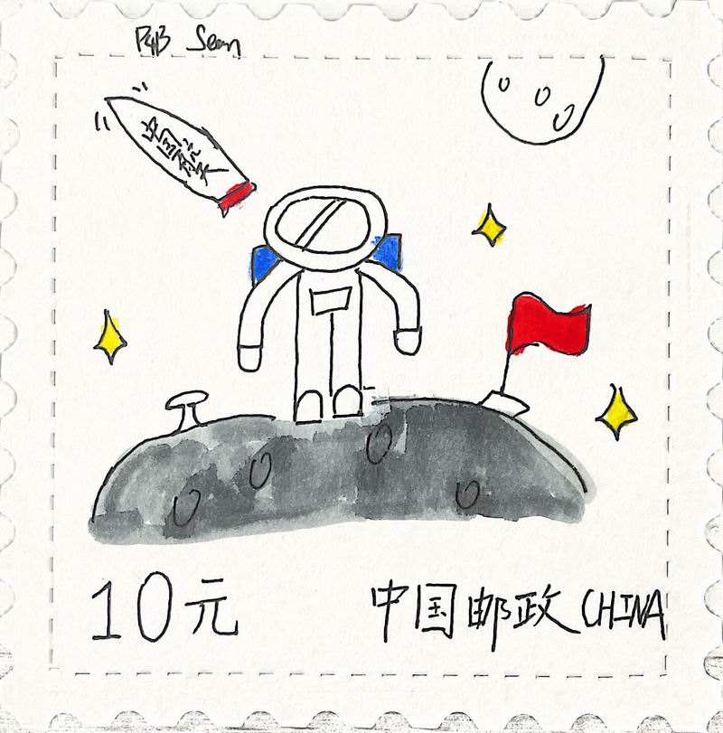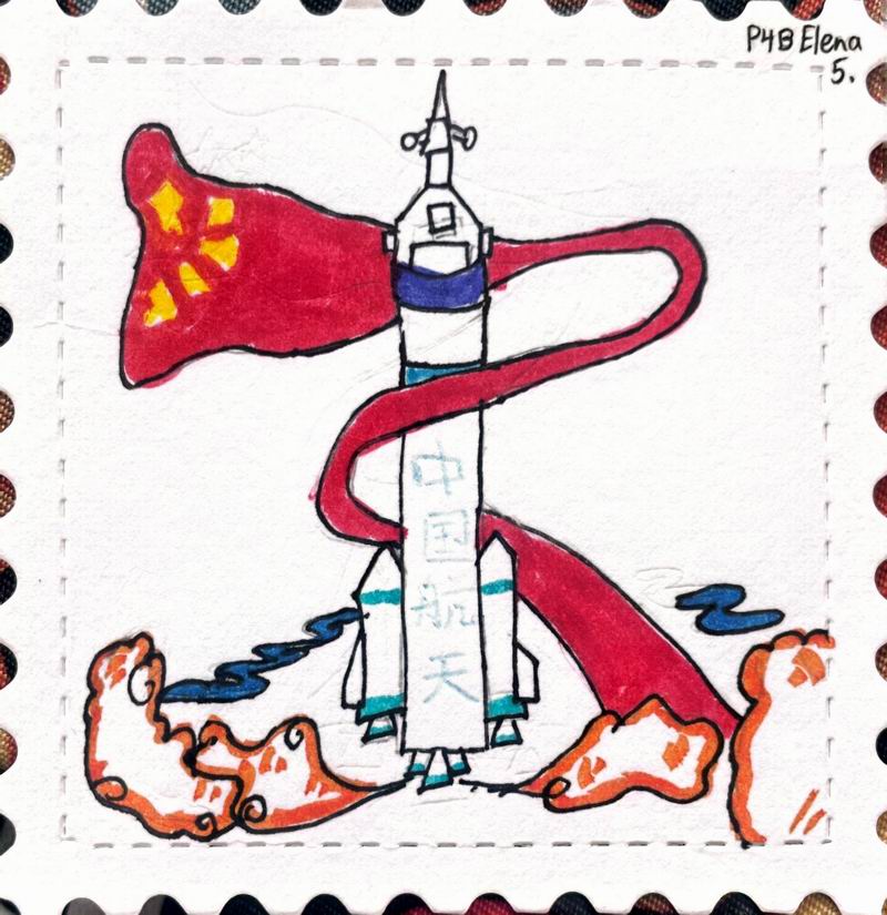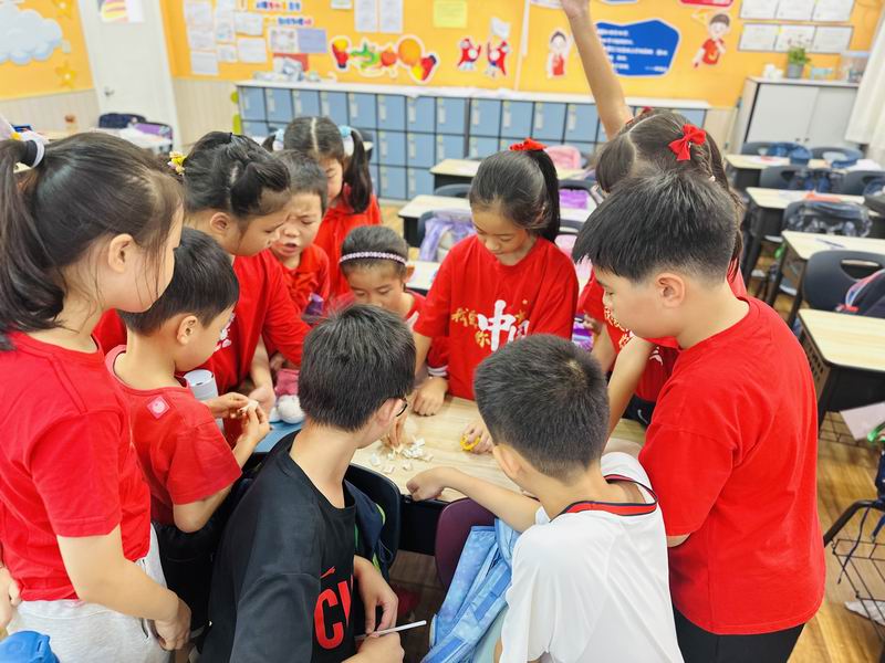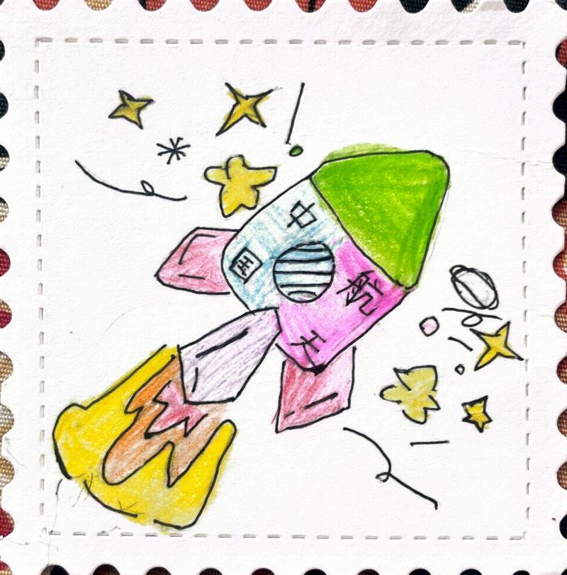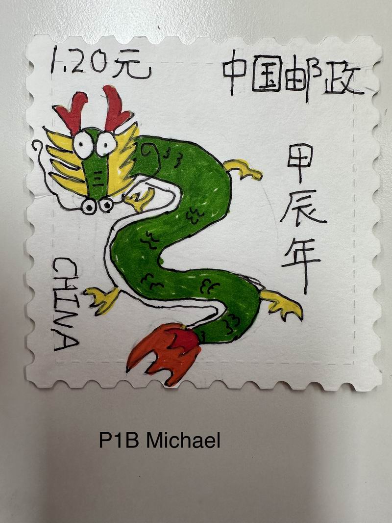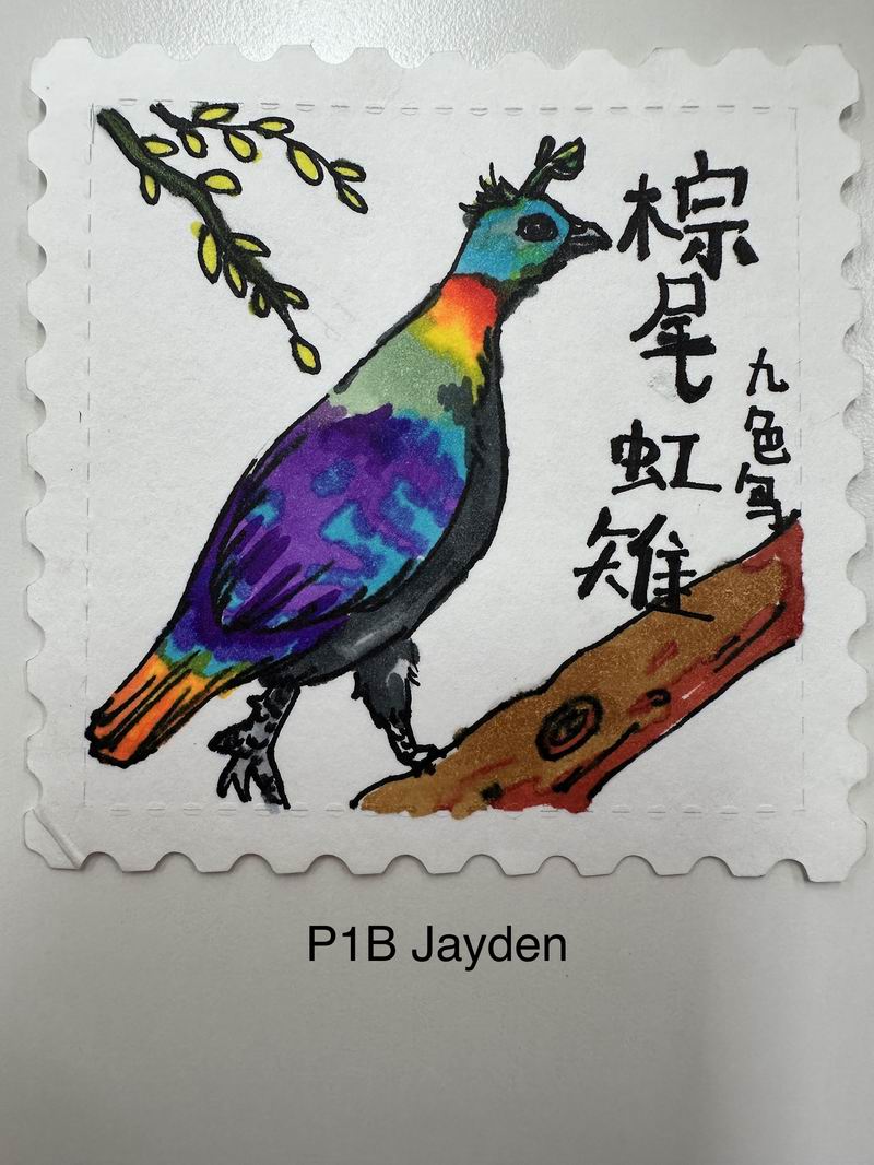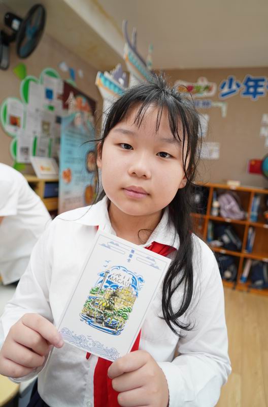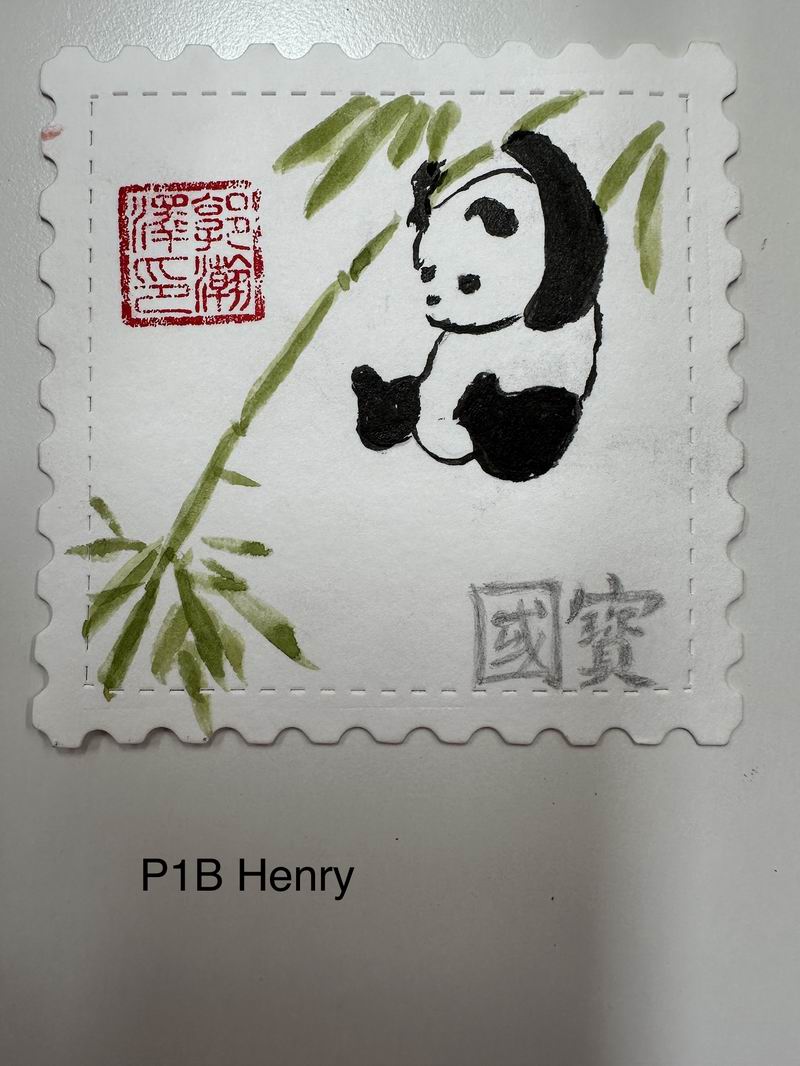 集會后的班級活動以互動體驗為主,學生參與了愛心手環制作和郵票設計的分享。在手工活動中,孩子們親手制作的手環,象征著對祖國的熱愛與團結。每個學生還設計了一張與中國相關的郵票,郵票內容涵蓋了動物、傳統節日、名勝古跡、科技成就等主題。