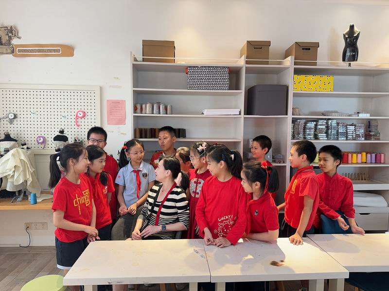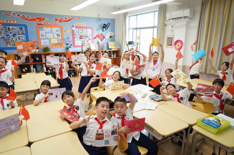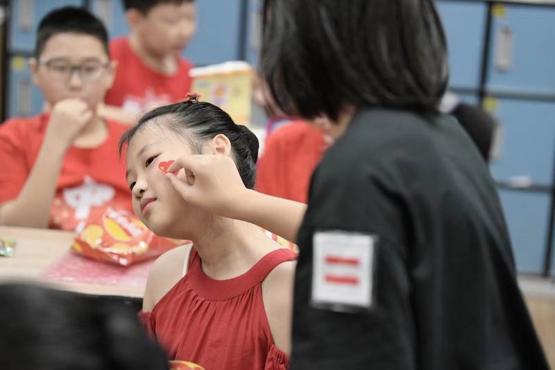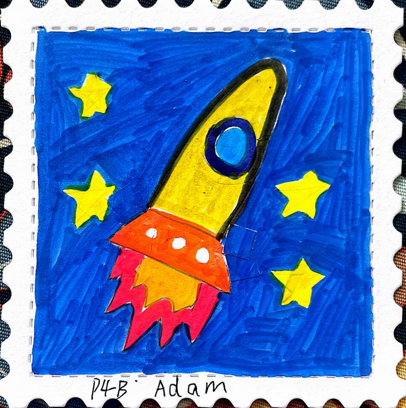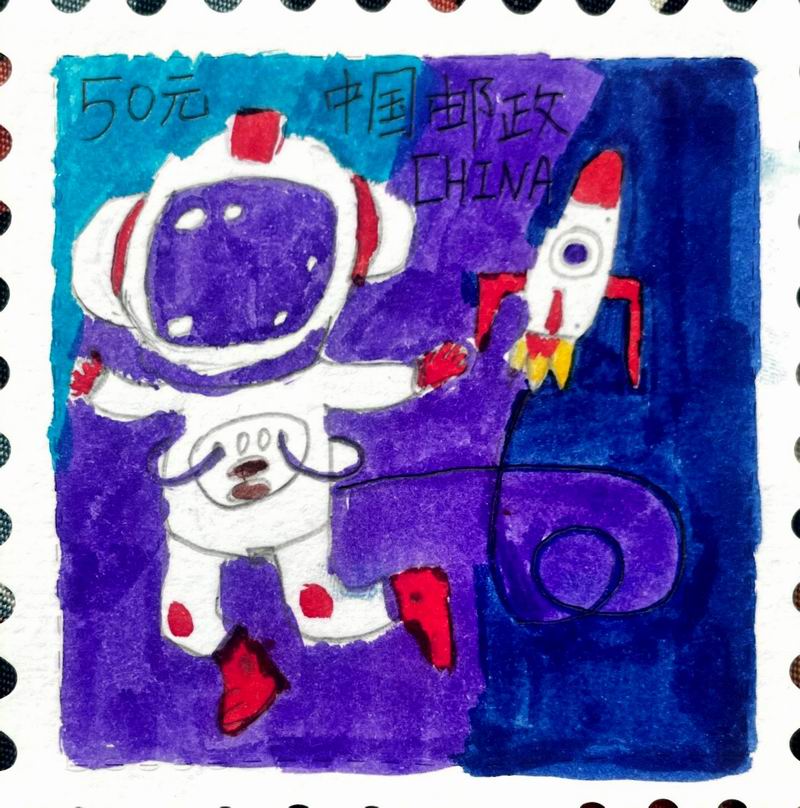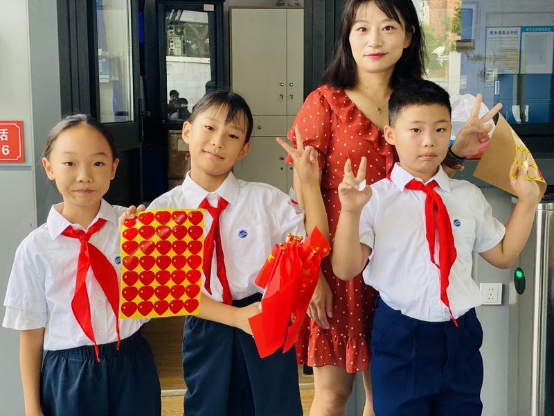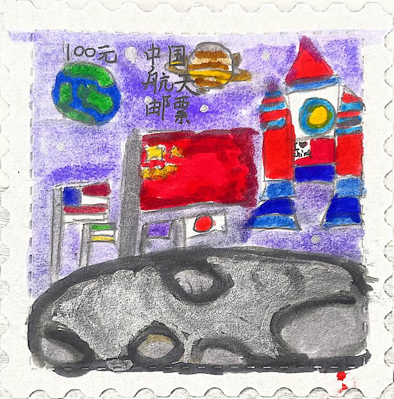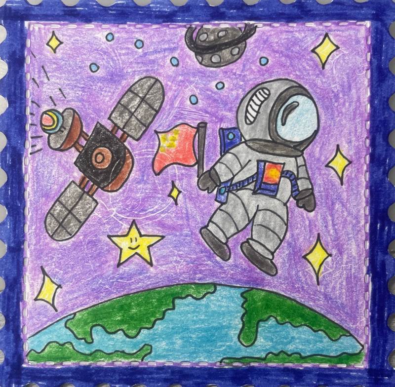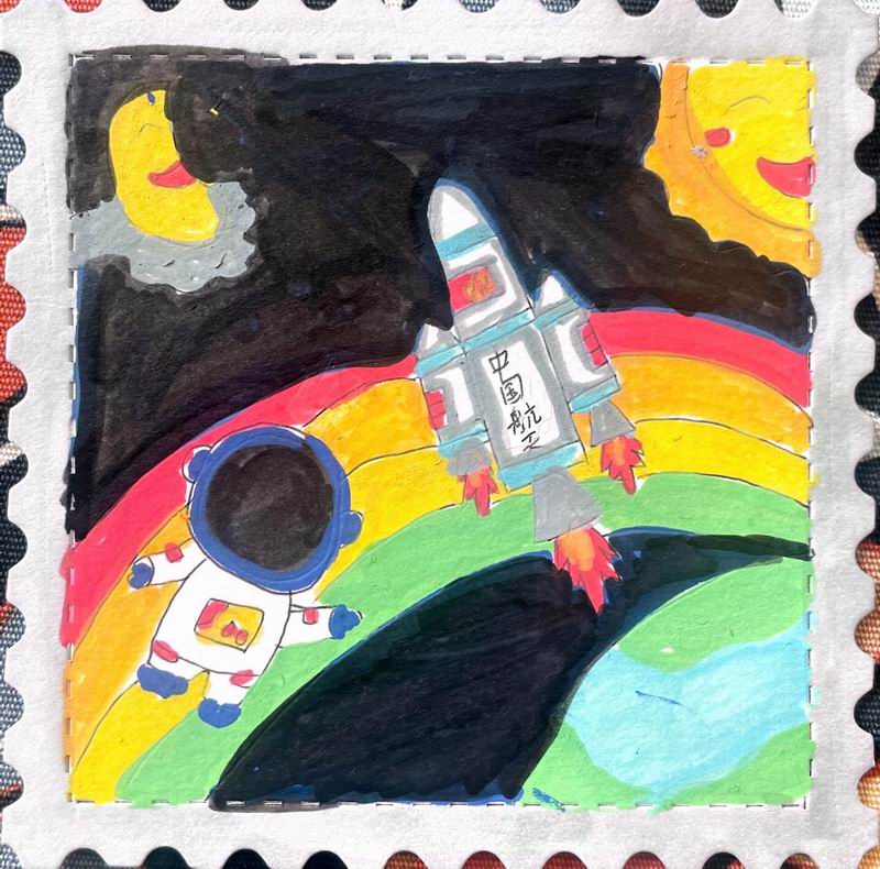 集會后的班級活動以互動體驗為主,學生參與了愛心手環制作和郵票設計的分享。在手工活動中,孩子們親手制作的手環,象征著對祖國的熱愛與團結。每個學生還設計了一張與中國相關的郵票,郵票內容涵蓋了動物、傳統節日、名勝古跡、科技成就等主題。