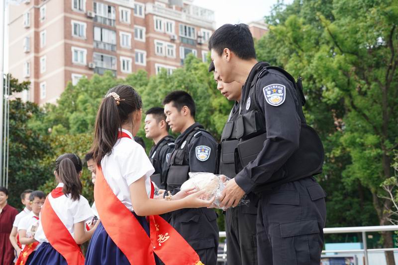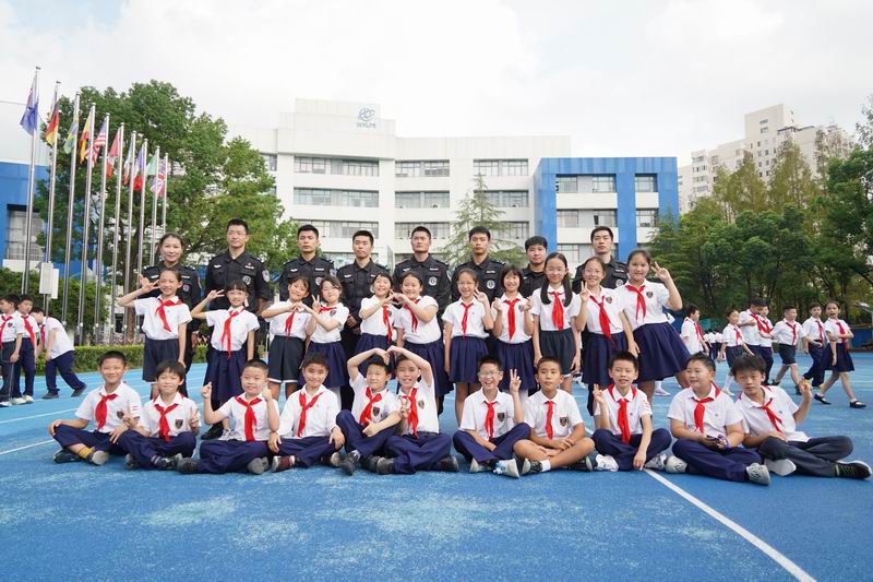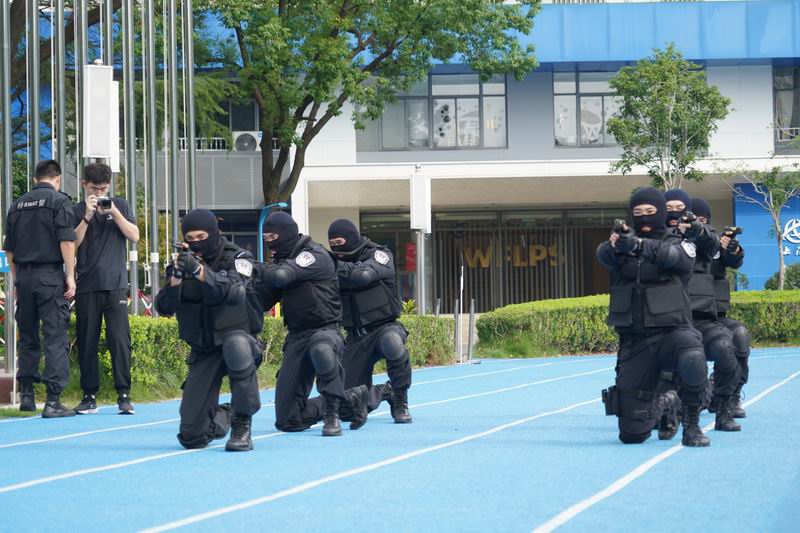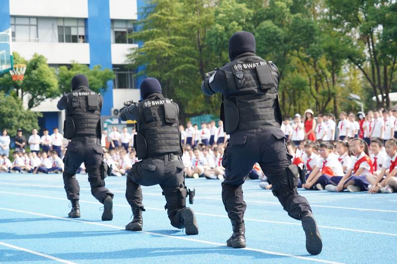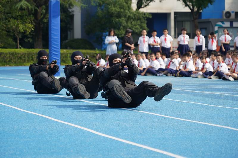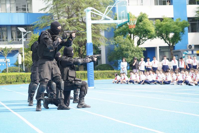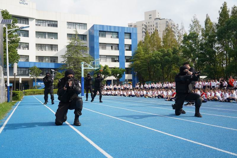 值得一提的是,這次升旗儀式邀請到了上海市公安局徐匯分局的特警支隊作為嘉賓。他們帶來了專業的警務展示,動作到位、剛勁有力,技能嫻熟、游刃有余,隊員間紀律嚴明、配合緊密、訓練有素,隨后,特警叔叔用平實而動人的話語,講述著日常的訓練和自己守護家園的小故事。現場的孩子們簇擁著,聽得認真,看得入迷,這也許是他們第一次與那些平日里只在電視屏幕和遙遠傳說中見過的特警叔叔們一場前所未有的親密接觸。掌聲一陣接一陣,特警的風采也激發了學生們對國家安全衛士的崇高敬意,孩子們眼中閃爍著對英雄的崇拜,種下了一顆顆關于勇氣、責任的小種子。校長致詞中說到:“這群最可愛的人以千錘百煉的意志、艱苦卓絕的訓練鑄就技藝精湛的技能,保家衛國的責任擔當、濃情厚意的家國情懷激發世外少年“少年強則國強”的遠大志向”。愿你們以堅定的步伐,踏著歷史的節拍,迎接這偉大的時刻。