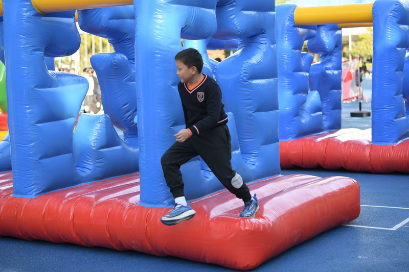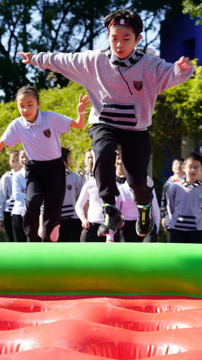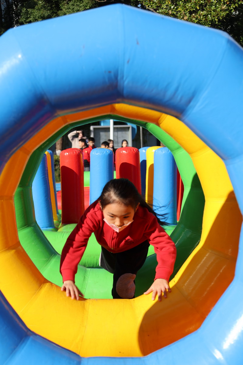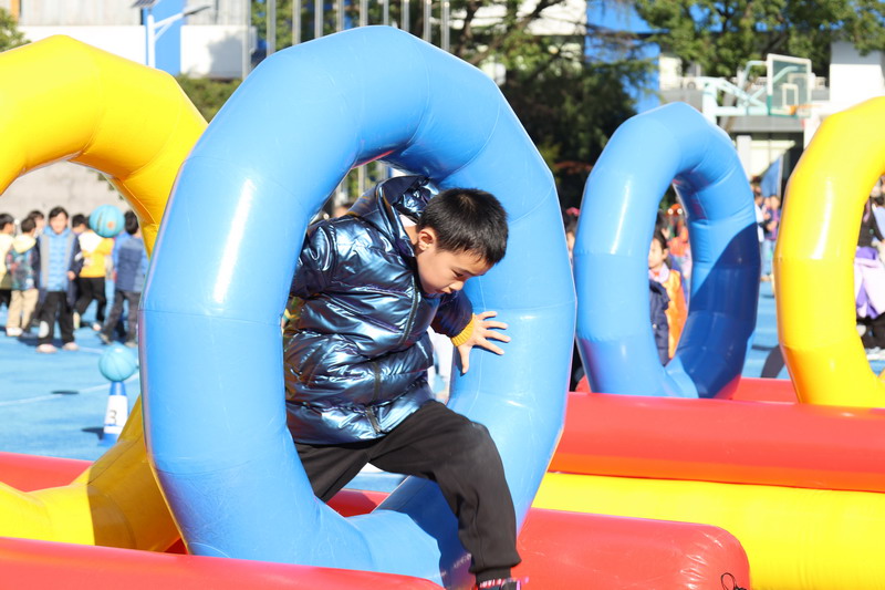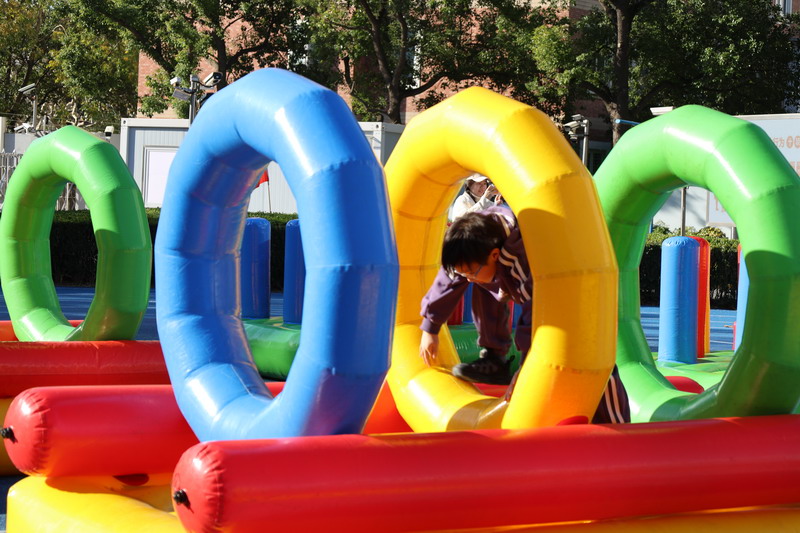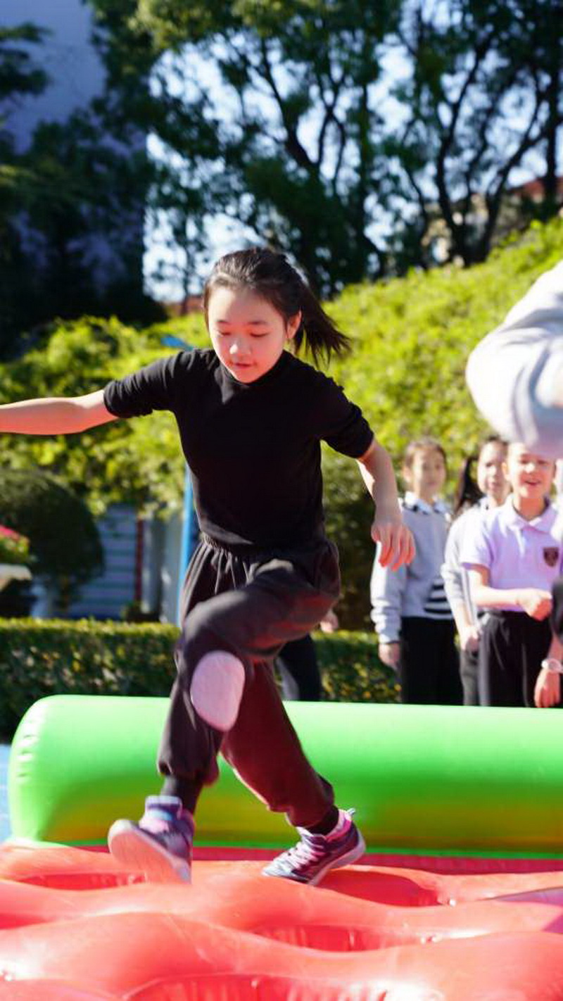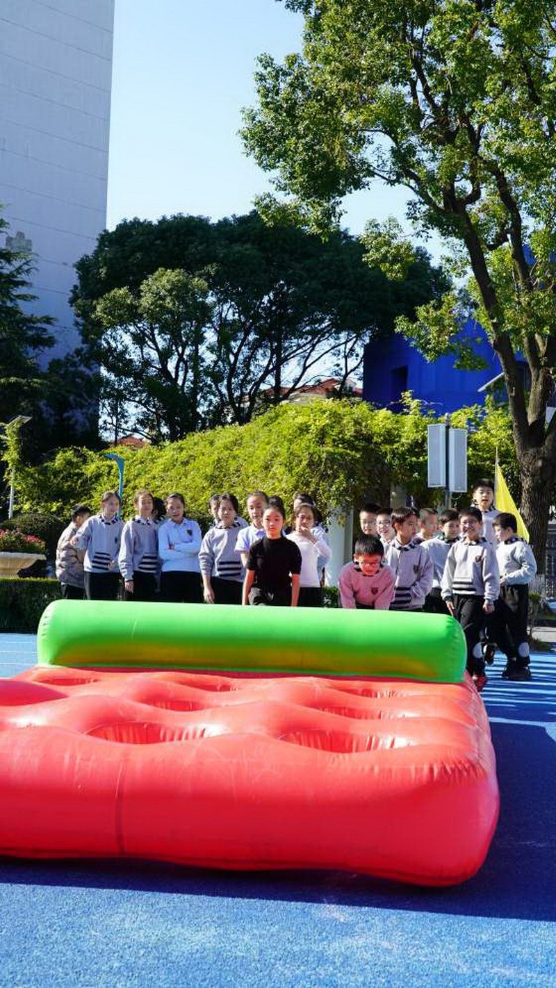 國際部學(xué)生們?nèi)巳藚⑴c 11 項充滿趣味的游戲活動。這些游戲項目各具特色,有考驗團(tuán)隊協(xié)作的“上上下下傳球”、有結(jié)合國際部足球、籃球課程的“運球接力”、有挑戰(zhàn)力量和速度的“翻滾的輪胎”,還有四個色彩鮮艷的“龐然大物”,那是障礙接力跑。