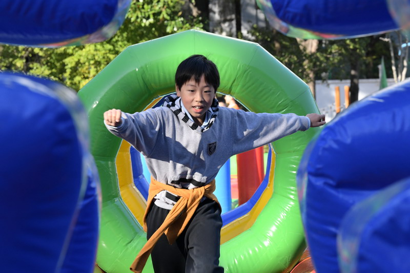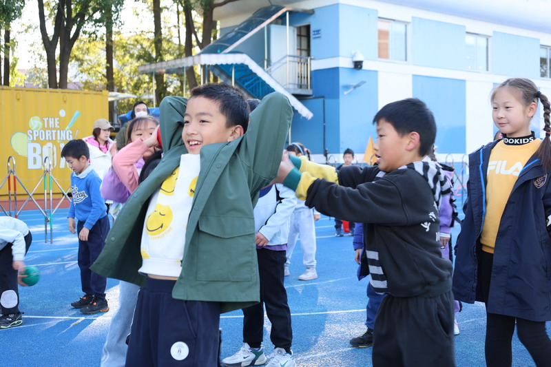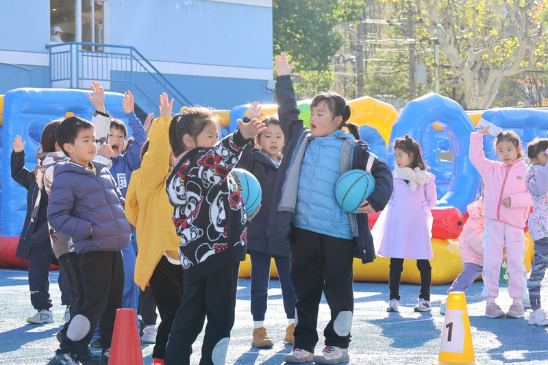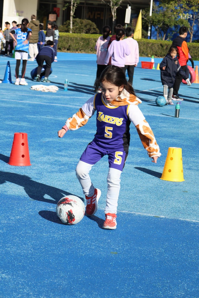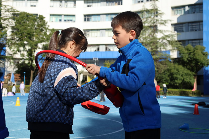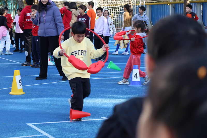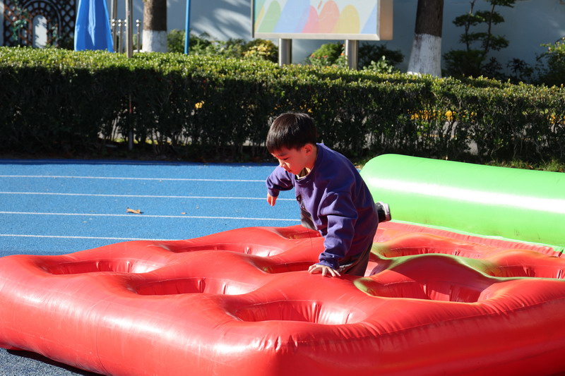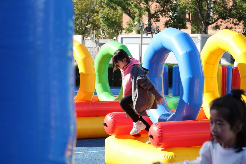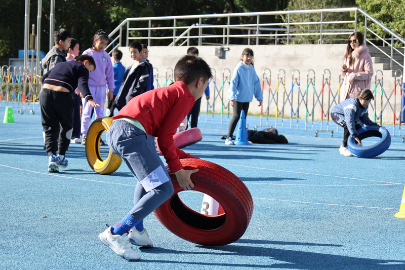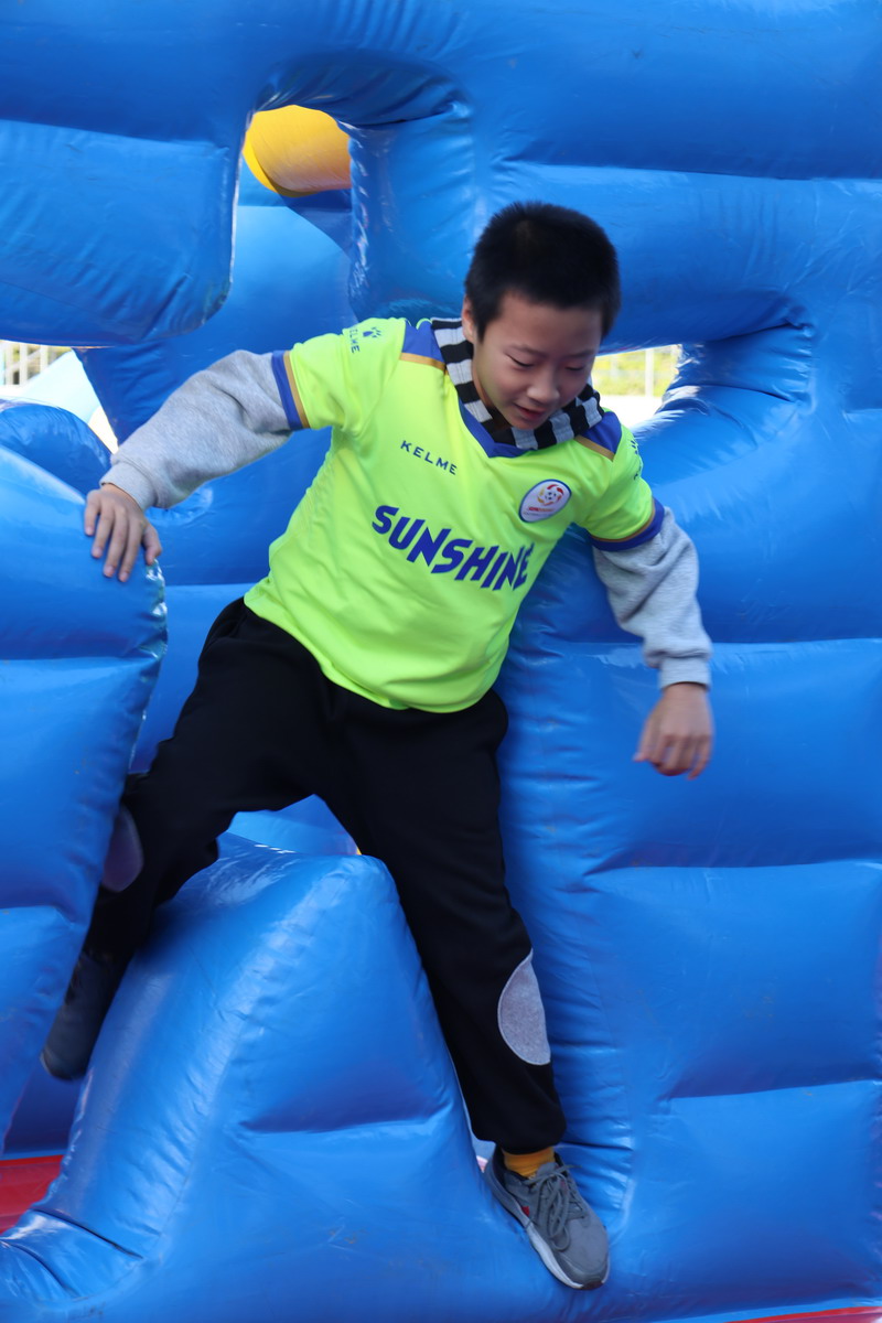 國際部學(xué)生們?nèi)巳藚⑴c 11 項充滿趣味的游戲活動。這些游戲項目各具特色,有考驗團(tuán)隊協(xié)作的“上上下下傳球”、有結(jié)合國際部足球、籃球課程的“運球接力”、有挑戰(zhàn)力量和速度的“翻滾的輪胎”,還有四個色彩鮮艷的“龐然大物”,那是障礙接力跑。