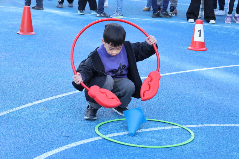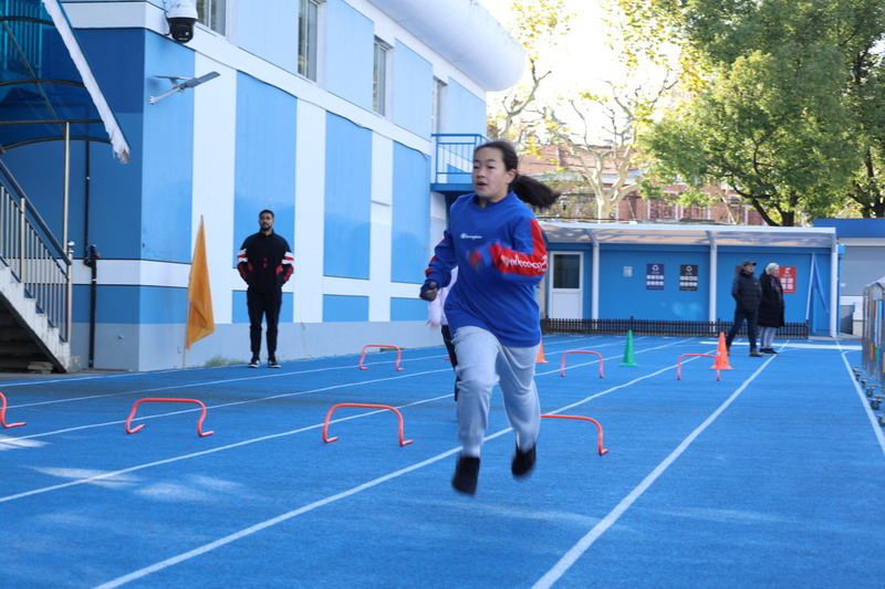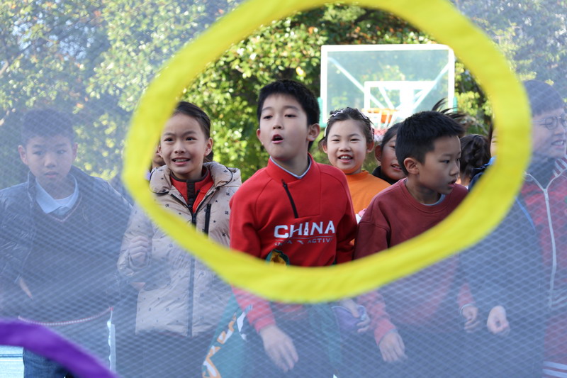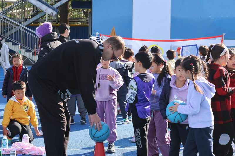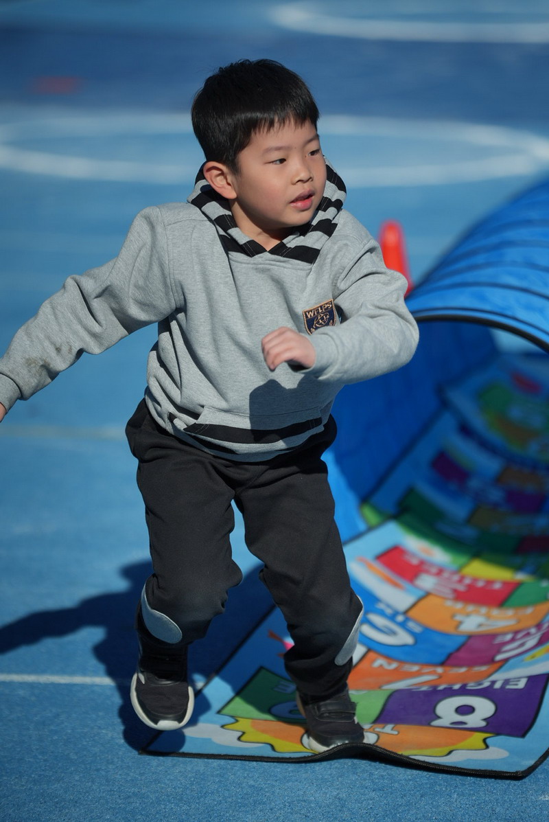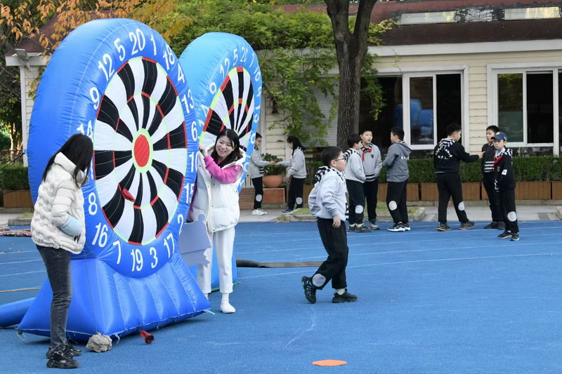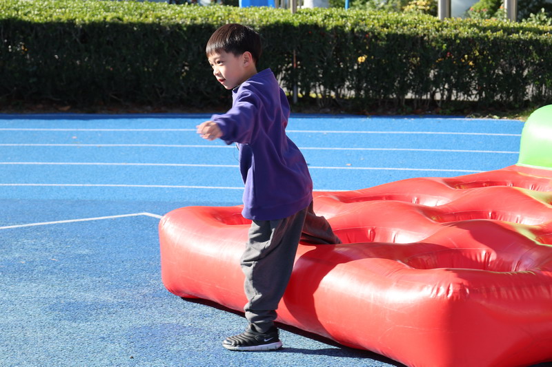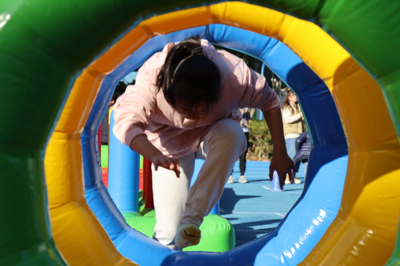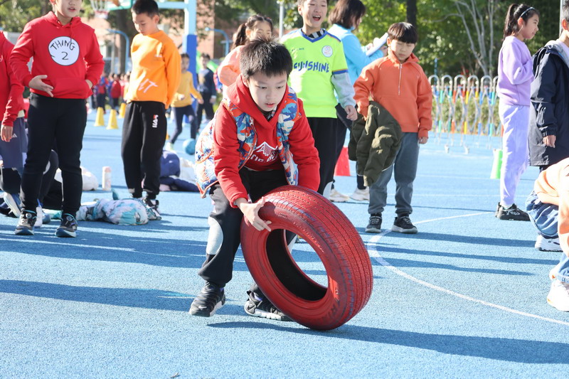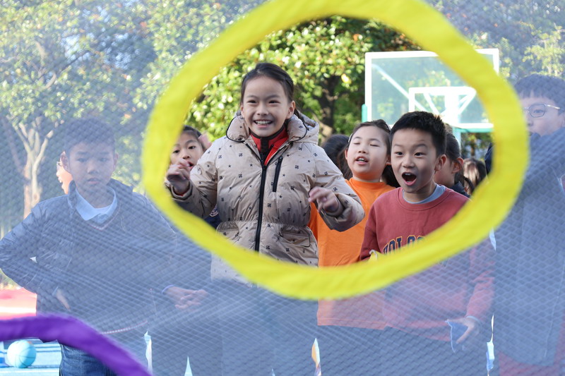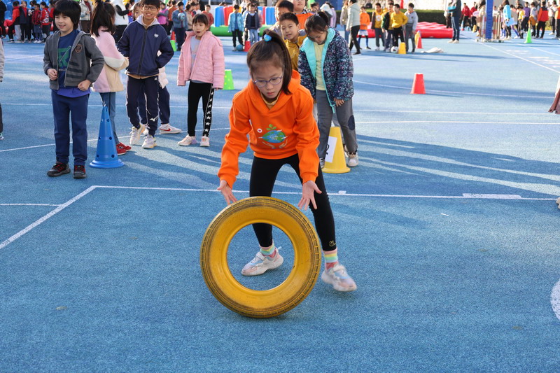 國際部學(xué)生們?nèi)巳藚⑴c 11 項充滿趣味的游戲活動。這些游戲項目各具特色,有考驗團(tuán)隊協(xié)作的“上上下下傳球”、有結(jié)合國際部足球、籃球課程的“運球接力”、有挑戰(zhàn)力量和速度的“翻滾的輪胎”,還有四個色彩鮮艷的“龐然大物”,那是障礙接力跑。