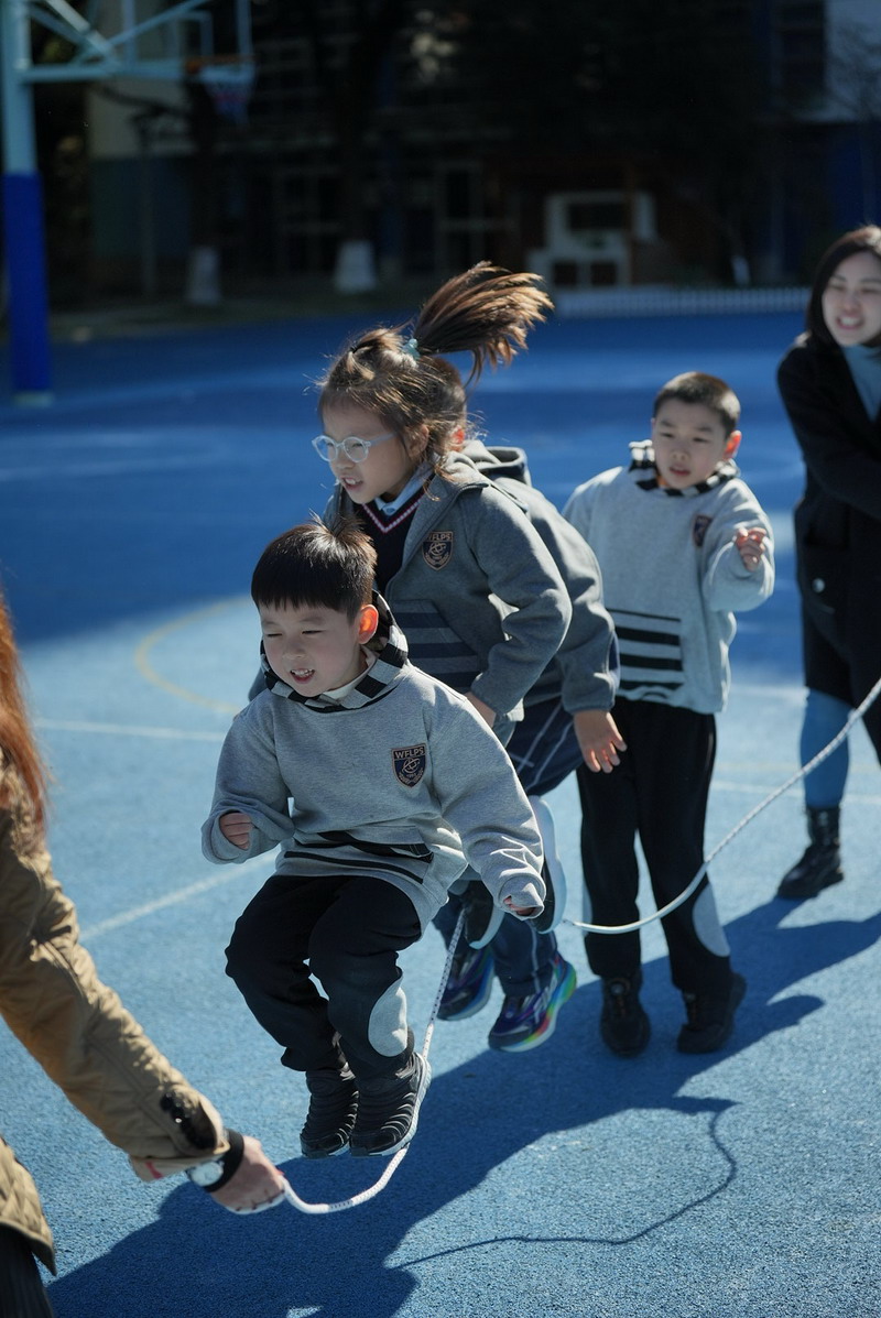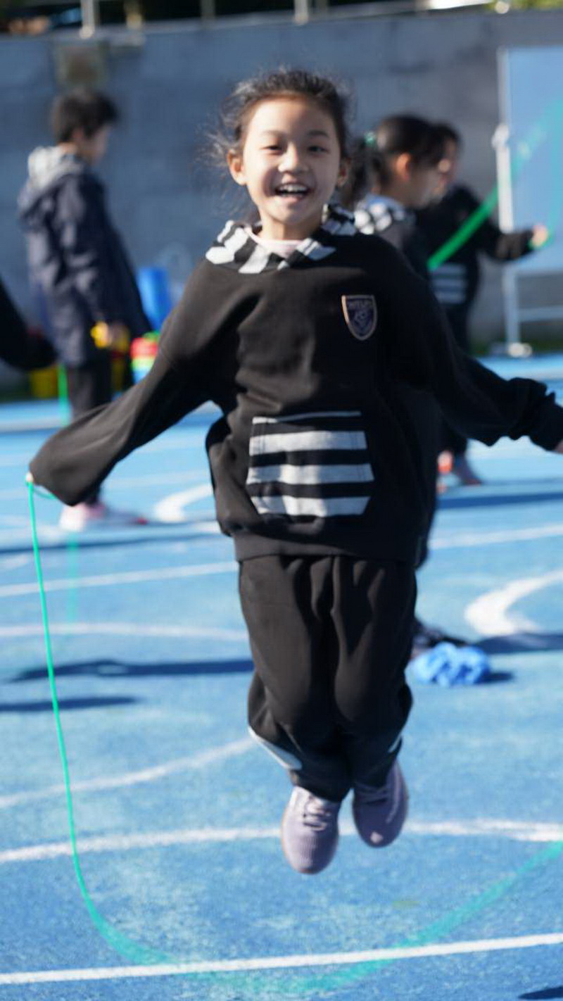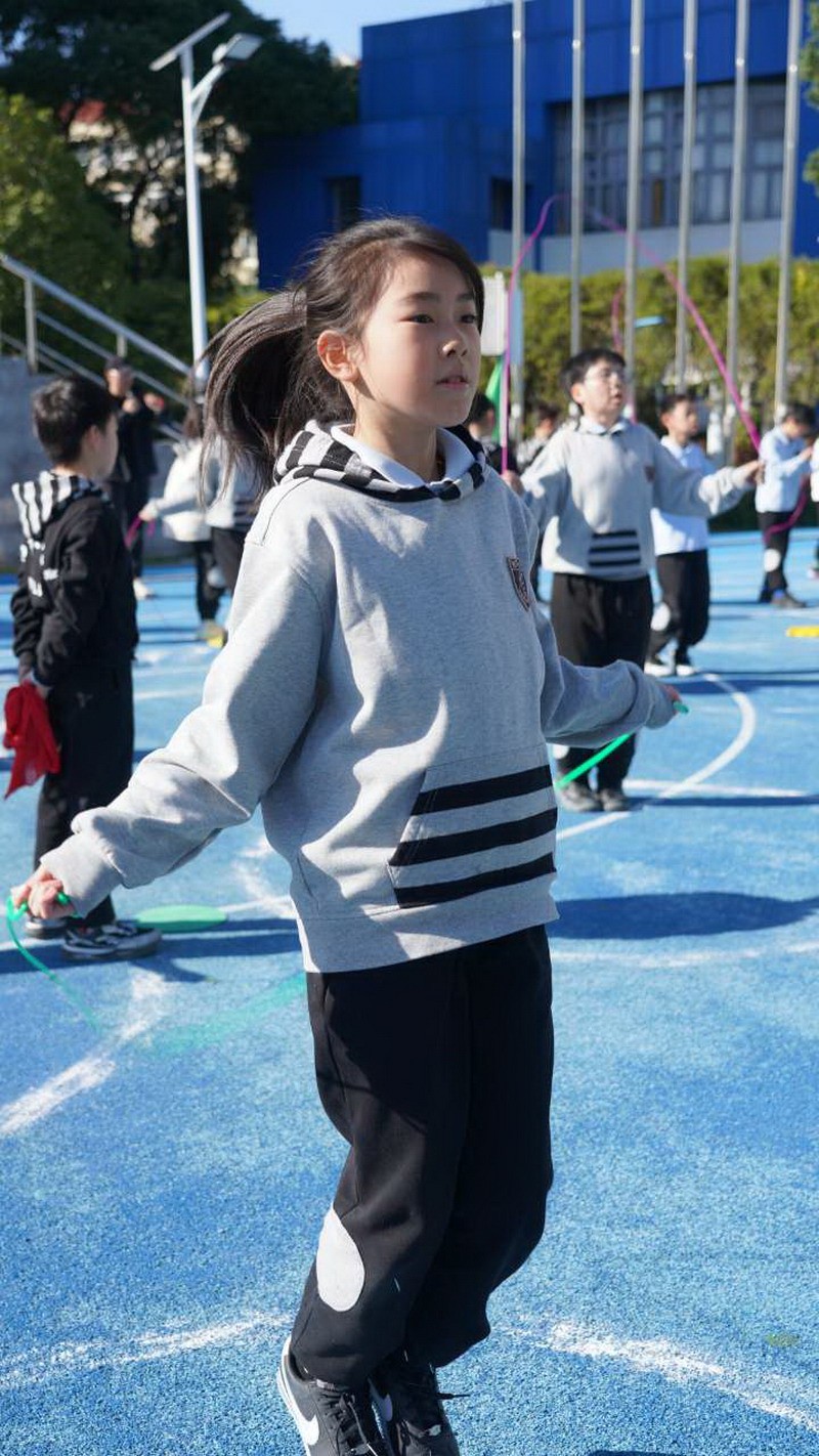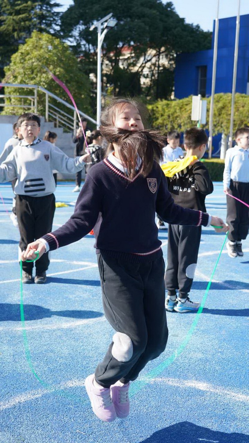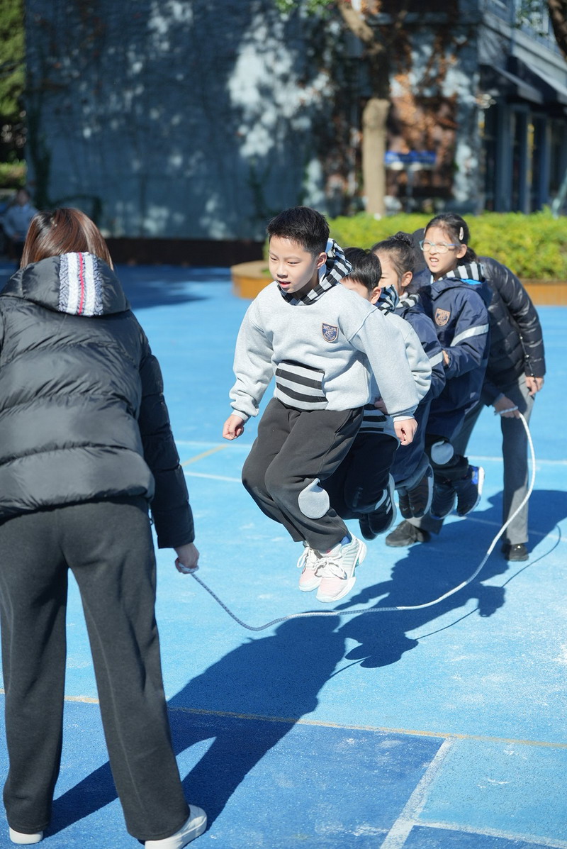 長繩比賽的現(xiàn)場,同學(xué)們配合默契。甩繩的同學(xué)有節(jié)奏地?fù)]動雙臂,長繩在空中劃出一道道優(yōu)美的弧線。跳繩的同學(xué)依次沖進(jìn)繩圈,他們高高躍起,如同歡快的小鳥。一個接一個,流暢的動作如同行云流水,展現(xiàn)出了雙語部同學(xué)們之間的高度信任與協(xié)作。