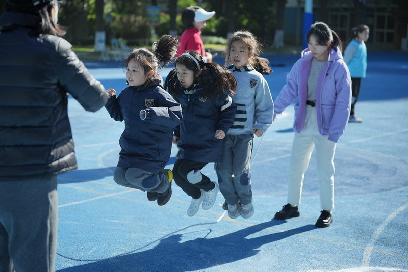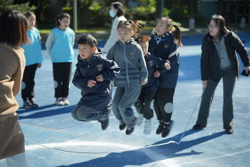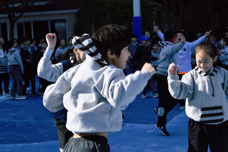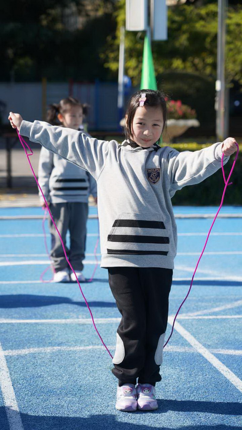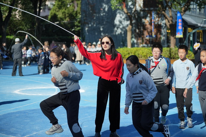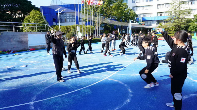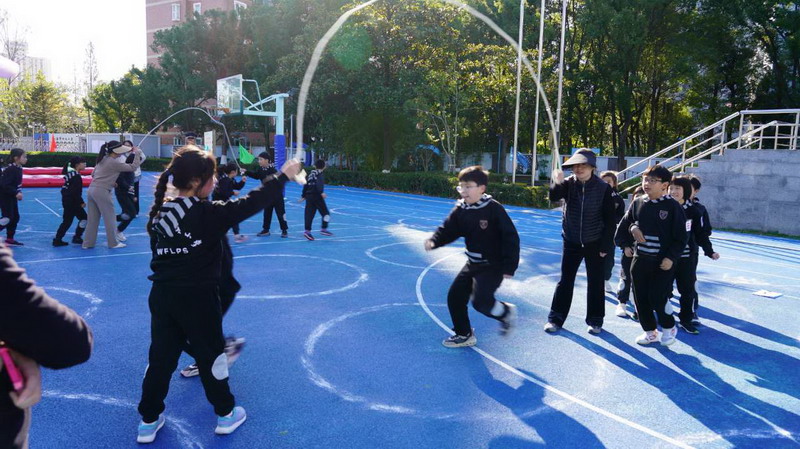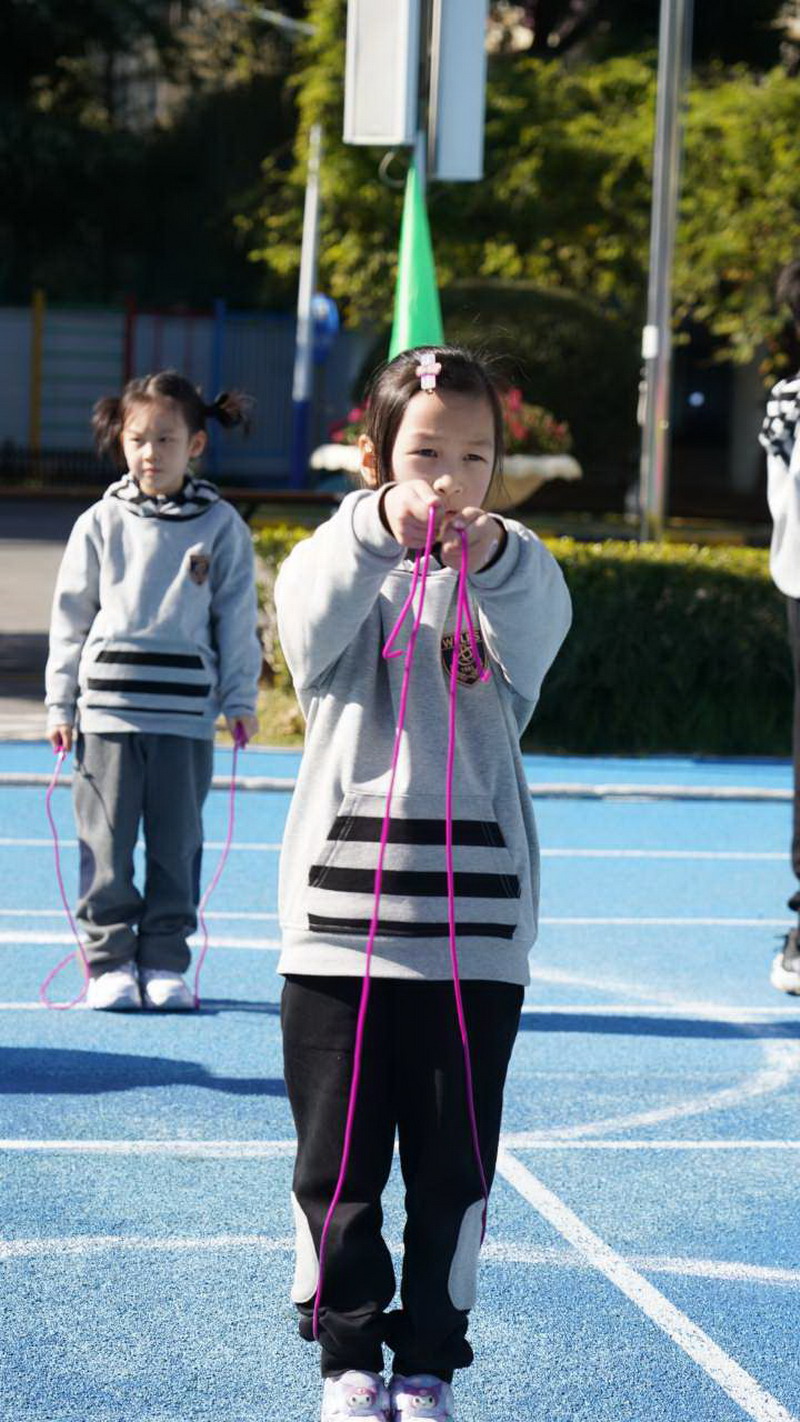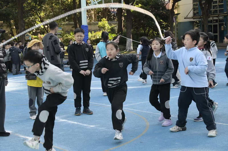 長繩比賽的現(xiàn)場,同學(xué)們配合默契。甩繩的同學(xué)有節(jié)奏地?fù)]動雙臂,長繩在空中劃出一道道優(yōu)美的弧線。跳繩的同學(xué)依次沖進(jìn)繩圈,他們高高躍起,如同歡快的小鳥。一個接一個,流暢的動作如同行云流水,展現(xiàn)出了雙語部同學(xué)們之間的高度信任與協(xié)作。