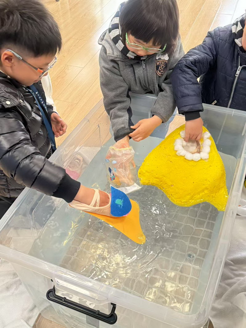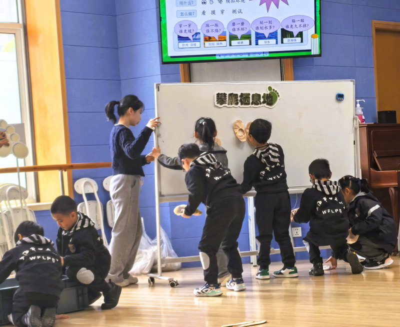 科學學科組將新教材一年級第二學期的《動物運動會》單元和《身邊的材料》單元的教學內(nèi)容進行融合,以“模仿動物的運動特征,設(shè)計一雙鞋子,幫助人們在不同環(huán)境行走”為驅(qū)動問題進行項目化學習。