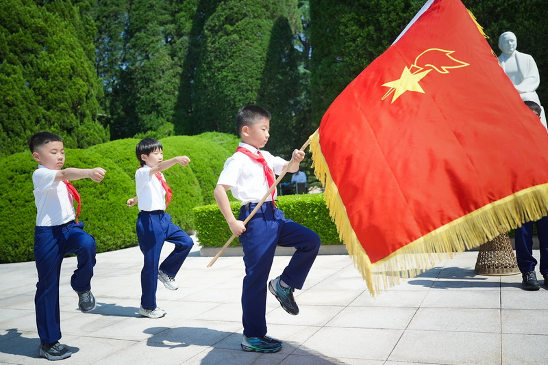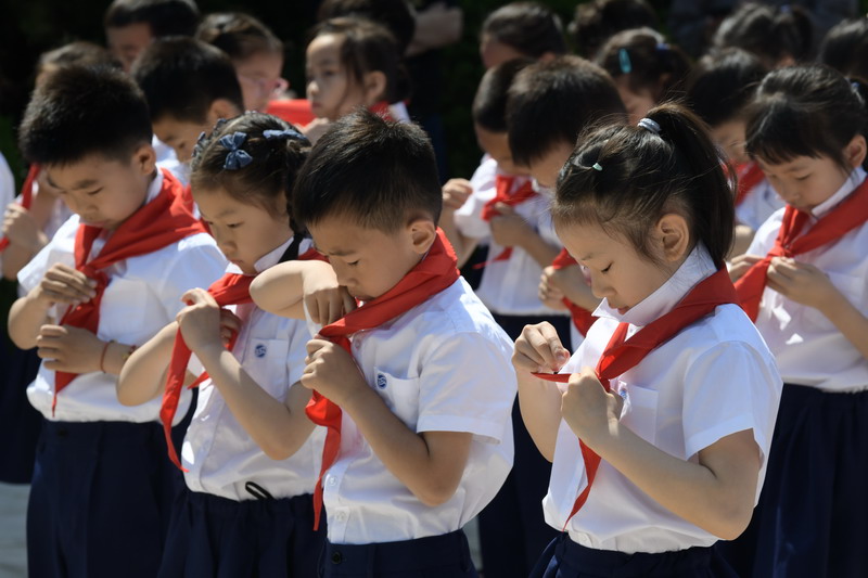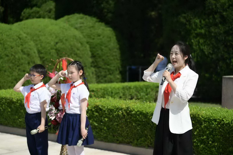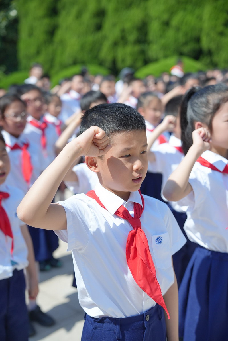 胸前的紅領巾迎風飄揚,新隊員們高高地舉起右手,跟著大隊輔導員胡老師在隊旗下莊嚴宣誓,稚嫩而堅定的聲音回蕩在陵園上空。這一刻,他們正式成為了光榮的中國少年先鋒隊隊員,肩負起了新的責任與使命。