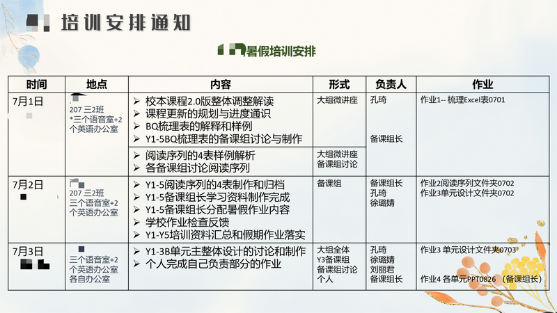 7月3日,培訓進入收官階段。各備課組持續推進專項任務:或完成新教材單元整體設計的首輪創作,或進行已有設計的二次優化,或完善新舊教材融合下問題鏈與話題鏈的邏輯建構。經過全天高效協作,全體教師如期完成新版主教材“單元整體設計四表”資源庫的建立,為新學期教學儲備了系統化校本資源。最后,各備課組長根據暑期研習計劃,部署了個性化的課程開發任務。