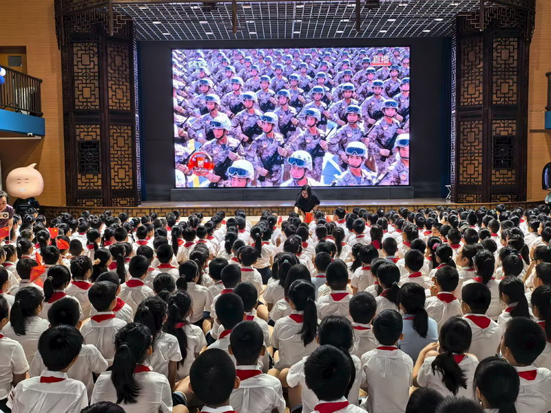 9月3日清晨,當長安街上的軍樂聲透過云端傳遍神州大地,世外小學的體育館、教室里早已匯聚起一片莊重的目光。全校師生端坐在屏幕前,以在線觀禮的方式,共同見證紀念中國人民抗日戰爭暨世界反法西斯戰爭勝利80周年閱兵儀式,在歷史與現實的交匯中,接受一場深刻的愛國主義精神洗禮。