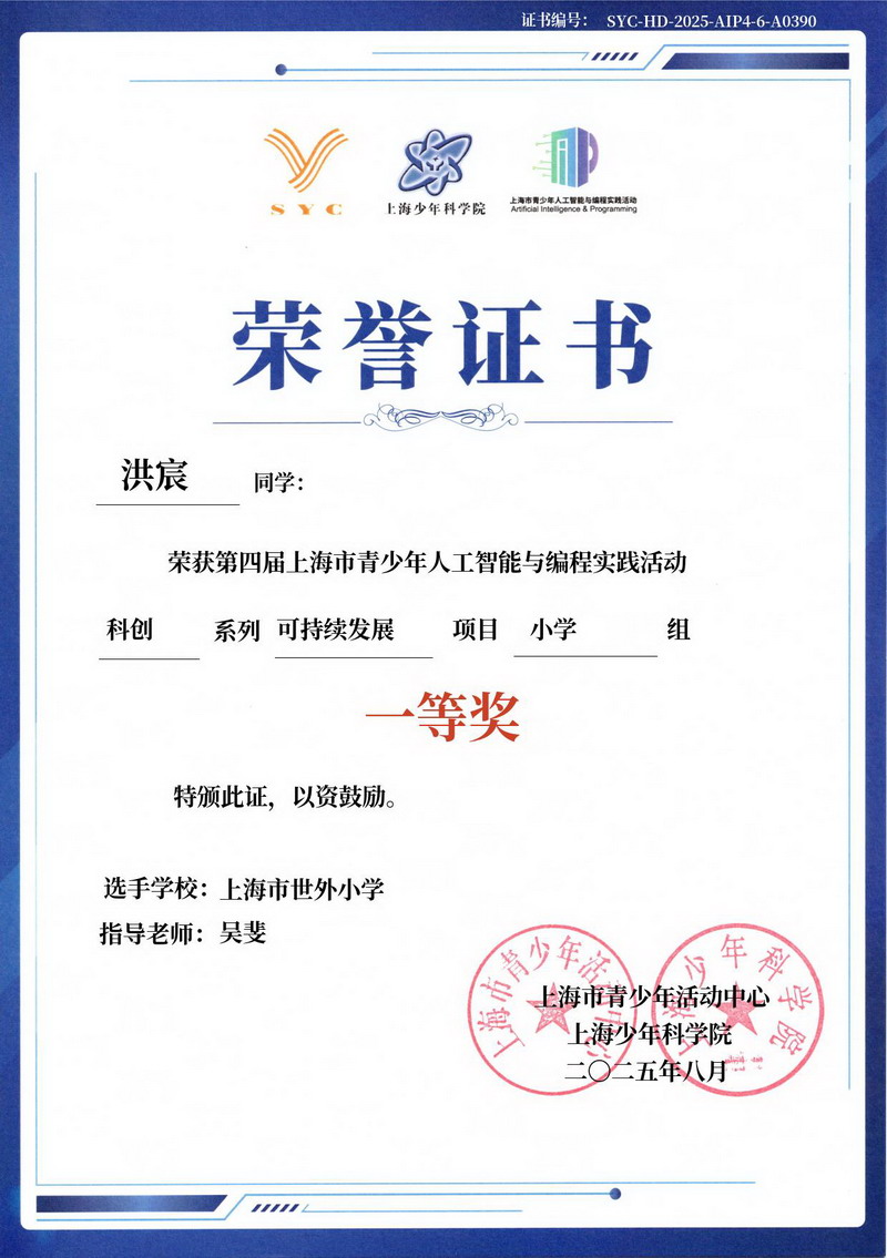 第四屆上海市青少年人工智能與編程實(shí)踐活動(dòng) | 一等獎(jiǎng) | 洪宸 |
