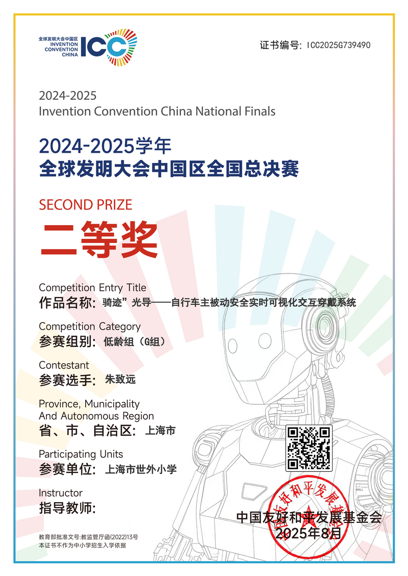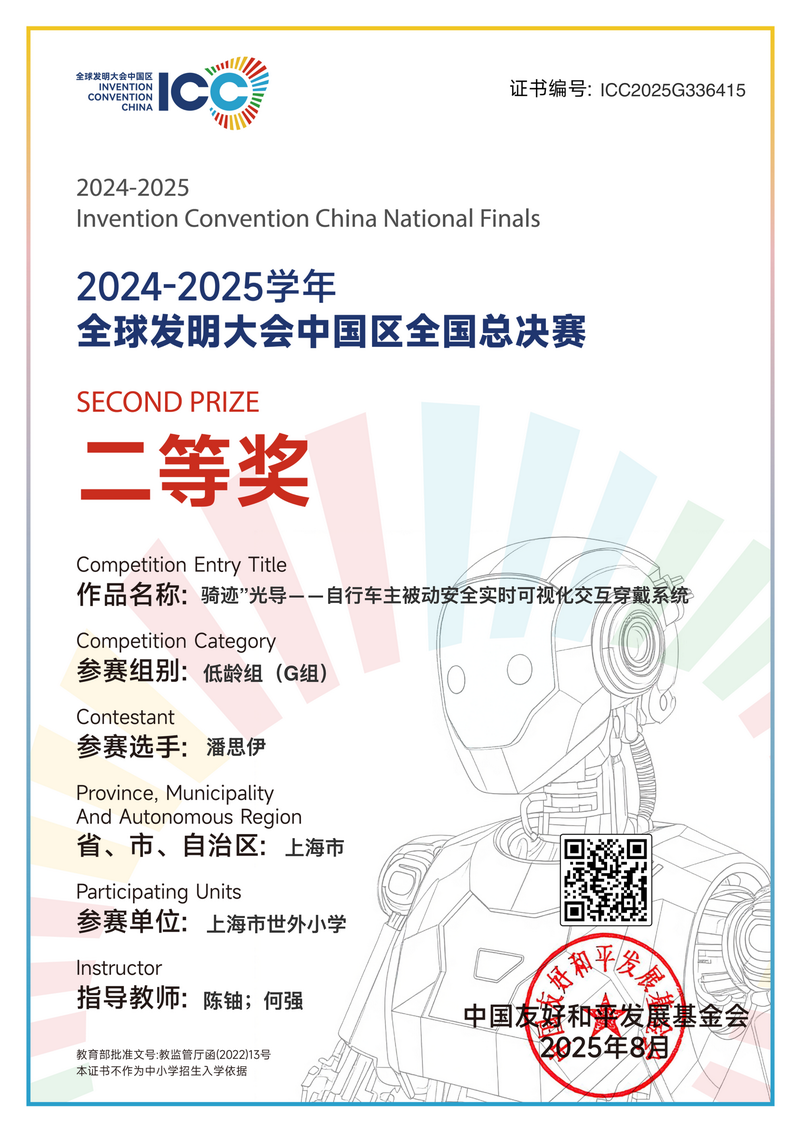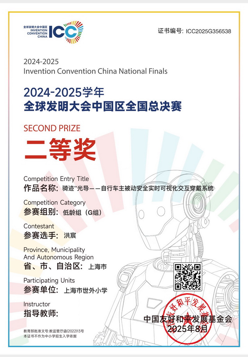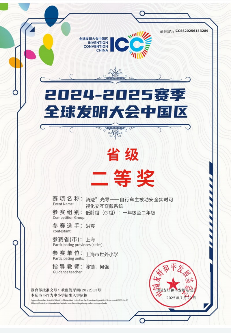 在2024-2025學(xué)年全球發(fā)明大會(huì)中國區(qū)ICC(Invention Convention China)的比賽中,我分別獲得了上海市一等獎(jiǎng)和全國總決賽一等獎(jiǎng)!