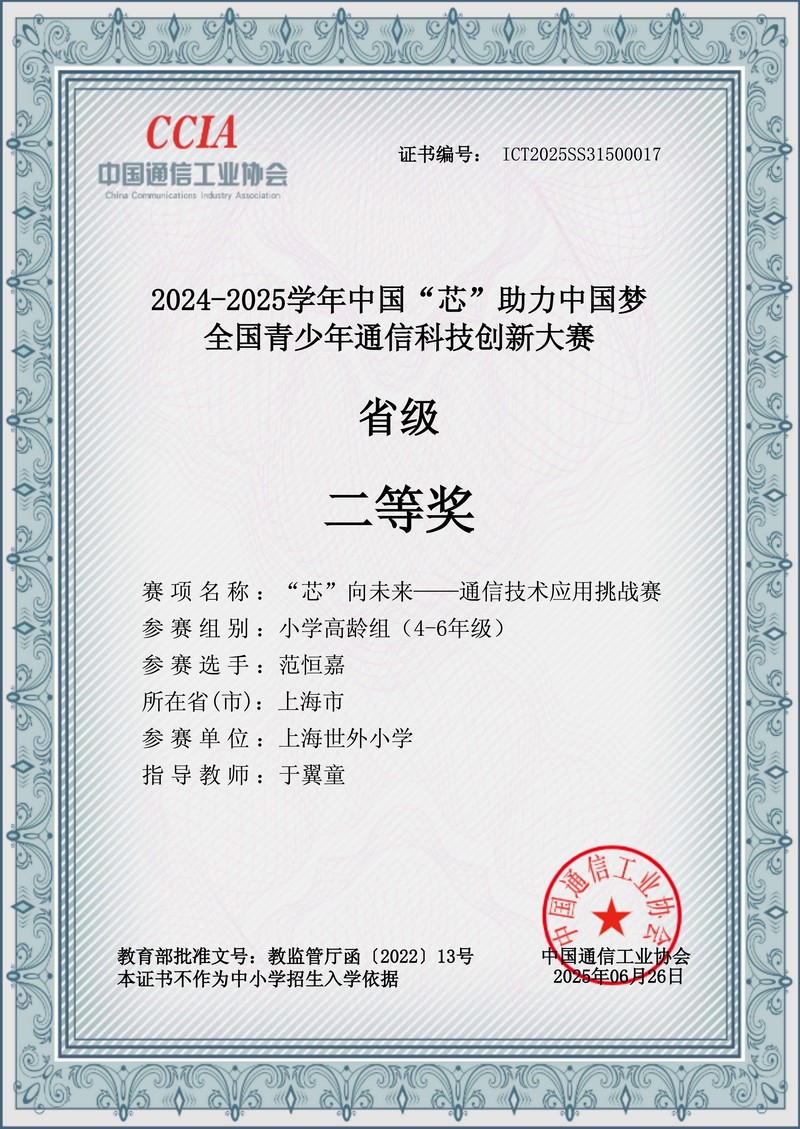 2024-2025學(xué)年中國“芯”助力中國夢(mèng) 全國青少年通信科技創(chuàng)新大賽 | 二等獎(jiǎng) | 范恒嘉 |
